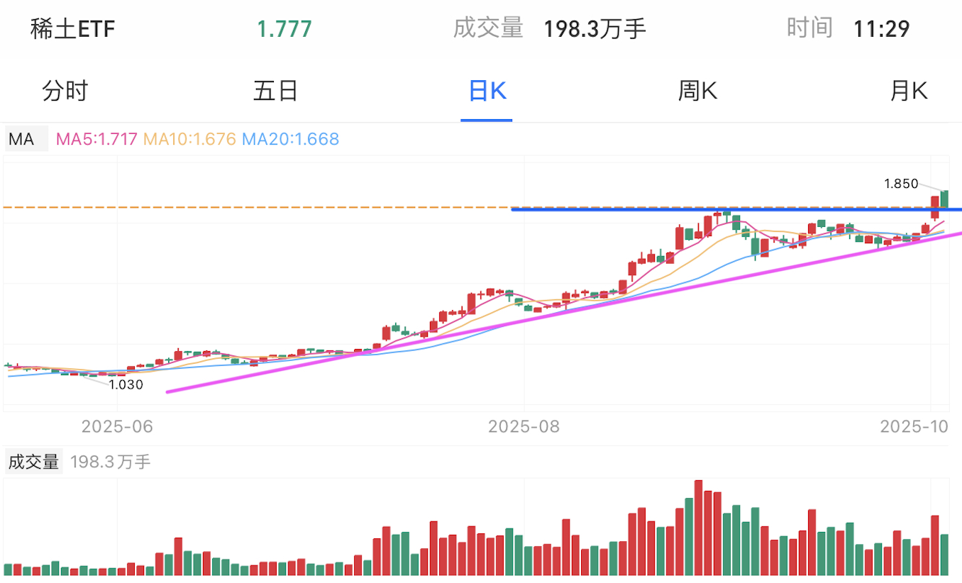 稀土近期有一波较大行情,后短期进入盘整期。这两日突然飙升,突破压力位,但很快回落,暂时没有跌破支撑位,不确定后市走向。