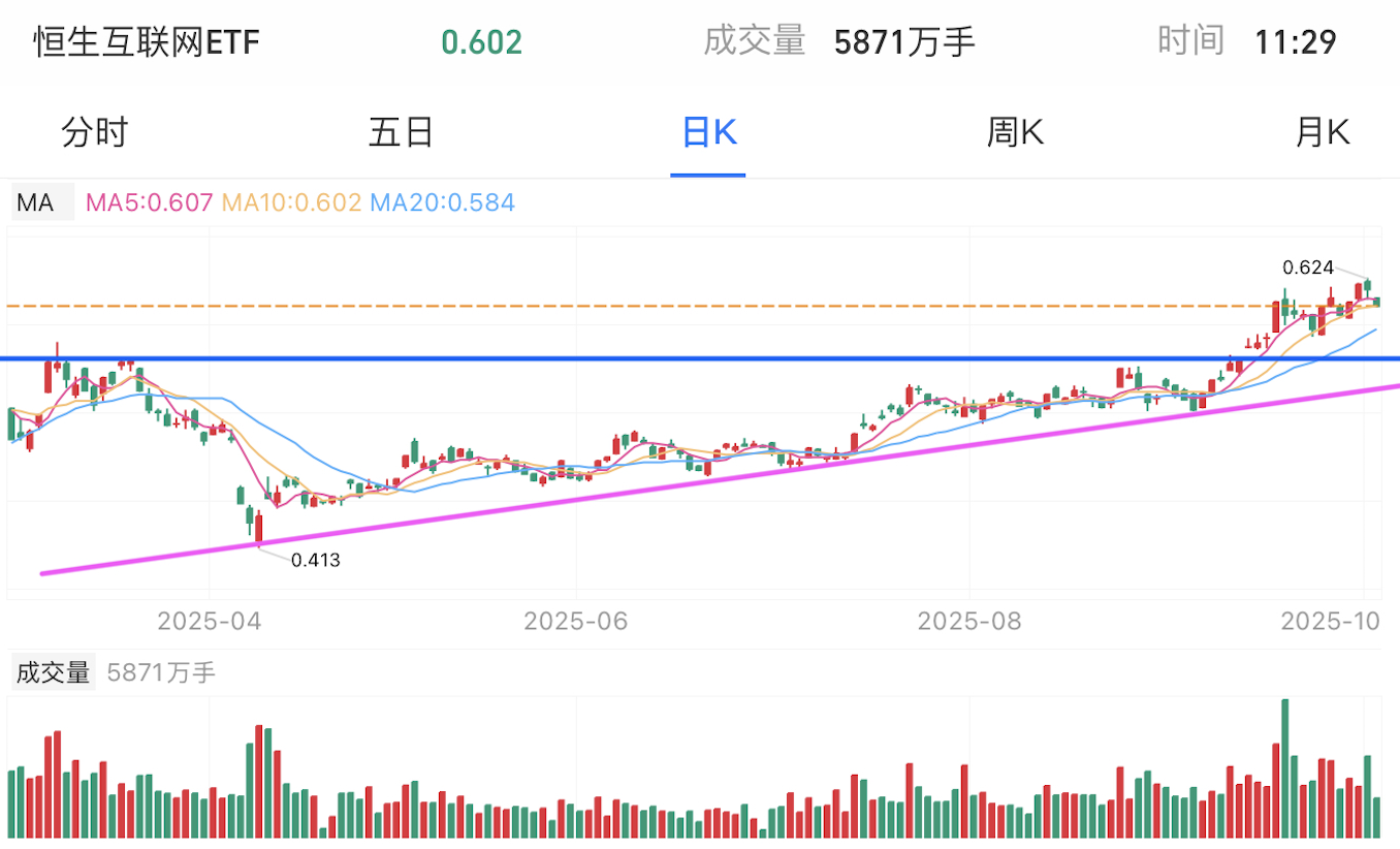 恒生互联网此前盘整,最近突破压力位,反转向上。但很快再次陷入盘整,这两日连续下跌且放量,暂时没有跌破上涨趋势线,后市方向不明。