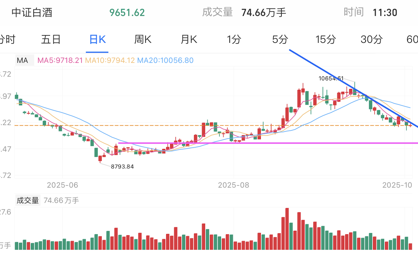 白酒此前在短暂反弹后很快回落,已经跌破前低支撑位,目前震荡下行趋势,靠近下方支撑和最低点强支撑位。