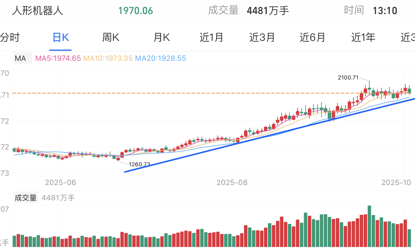 人形机器人近期震荡上行,短期大幅上涨后回落。前几日在上涨趋势线反弹,涨回压力位,但没有突破,继续在压力位下横盘震荡。