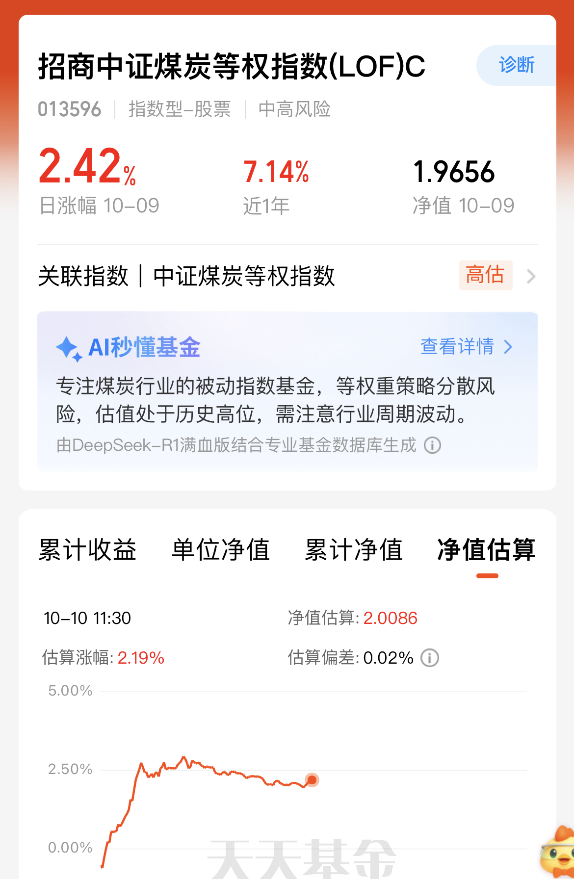 今日市场波动比较大,三大指数集体走弱,创业板指大跌4.14%,前期强势的科技板块更重挫5.23%,不过煤炭却逆势上涨,趁着行情不错,我打算加点$招商中证煤炭等权指数(LOF)C(OTCFUND|013596)$昨天上涨2.42%,今天估值又涨了2.19%。势头正劲。煤炭四季度周期性机会明确:政策端“反内卷”将持续推动行业自律,收缩供应支撑煤价;产能置换限制规模,产能或因指标不足进一步减少,供需紧平衡托底煤价。这只指数C类费率低、操作灵活,趁板块逆势上涨时加仓,正好借周期与政策红利抓行情。