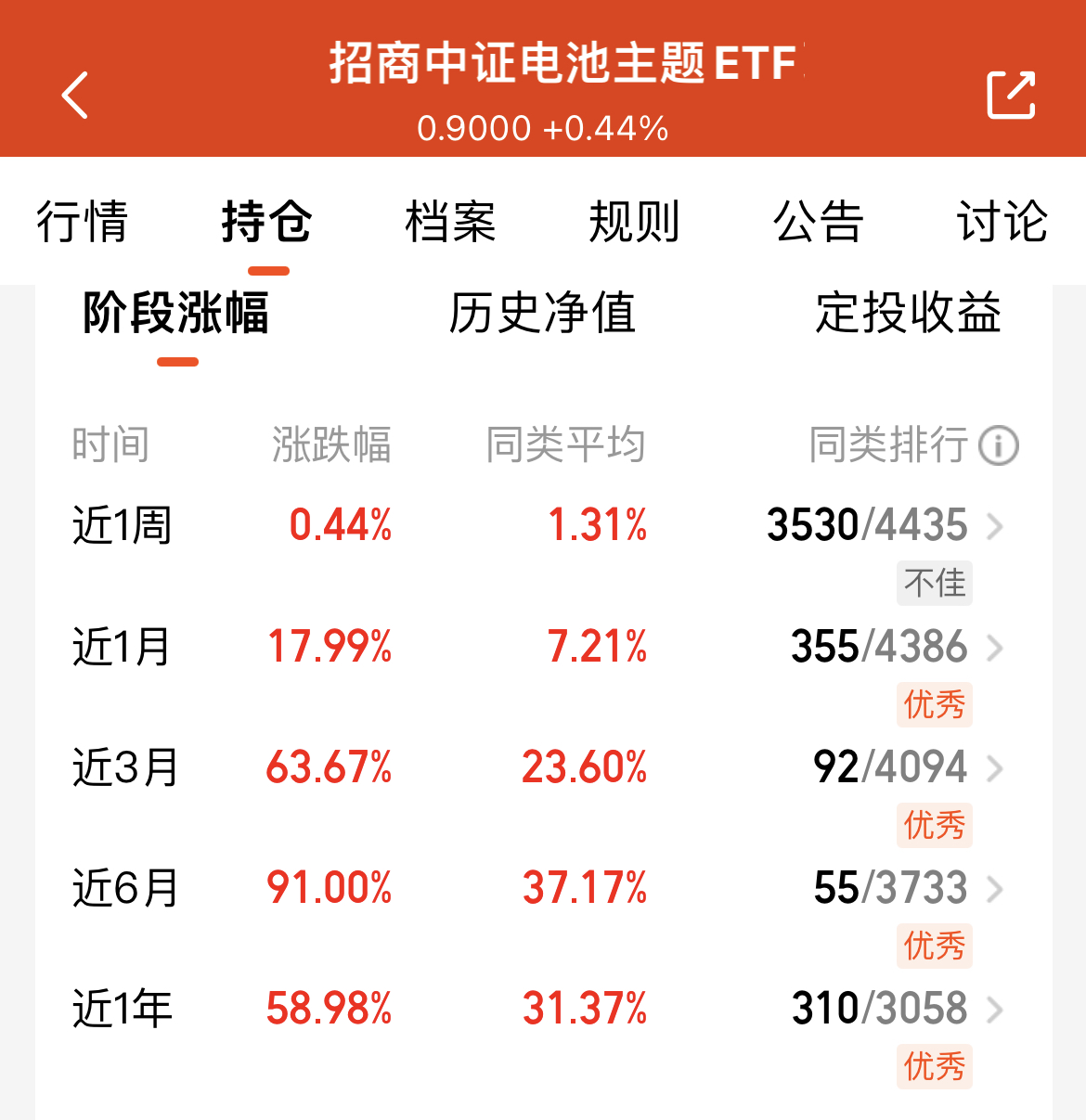 今日市场震荡调整,前期热门板块有些回调,板块轮动节奏也偏快,我想着趁这机会逢低加些$招商中证电池主题ETF联接C(OTCFUND|016020)$这只基金业绩挺亮眼的,近三个月涨了63.67%,近半年更是涨到了91%,大幅跑赢同类平均水平,超额收益明显。它能精准跟着电池全产业链走,像宁德时代这样的龙头,还有现在受关注的固态电池概念股都在持仓里,能把技术突破的红利都抓住。眼下QuantumScape和国内企业一起推进量产,中科院、清华这些团队也在关键技术上频频突破,卫蓝新能源还拿到了资本加注。它还是七天免赎回的,板块轮动时加减仓都灵活。趁现在调整加仓,正好借着它的弹性,稳稳卡位电池行业升级的行情。