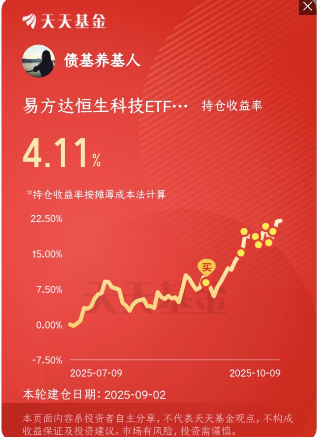 今天股市调整,港股也跟着调整了,正是加仓的机会。不用怕,10月美联储仍可能降息,这将吸引外资进一步回流港股市场。当前港股科技板块估值处于历史低位,横向对比A股和美股,港股科技股明显处于估值洼地,具备较高的投资性价比。随着市场情绪逐步修复,港股科技板块有望迎来估值修复行情。我今天继续逢低分批加仓$易方达恒生科技ETF联接(QDII)C(OTCFUND|013309)$,该基持仓以优质科技龙头股为主,是具有核心竞争力的互联网平台企业及半导体、新能源等硬科技领域标的,长期看好。