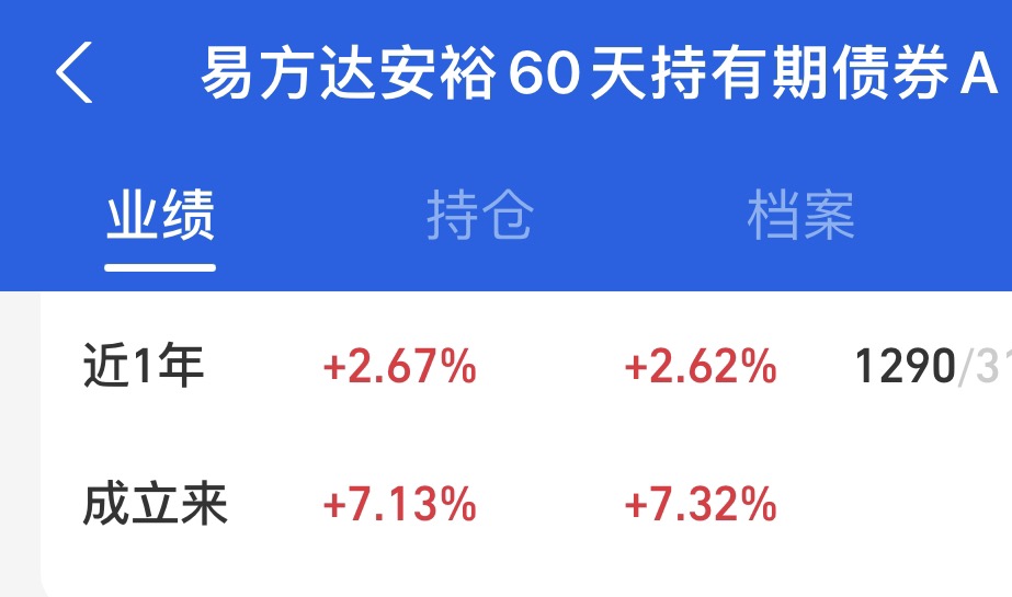 早盘权益市场全面回调,债市继续回暖,当前股市在突破前高之后有回调的迹象,因此个人今天配置一部分$易方达安裕60天持有债券A$ 稳一下收益,这只基持仓大部分都是信用中短债,主要以低回撤稳增长为目标,近一年最大回撤近0.09%,作为平稳底仓长期持有体验感较好,而从收益来看其近一年收益率2.67%,成立以来累计收益率7.13%,长期收益稳稳跑赢余额宝及货币基金,今年我的收益目标已达成,后面几个月主要以稳收益为主啦!