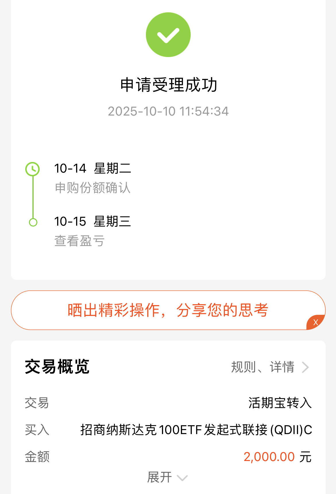 今日市场波动加大,昨晚美股也有所调整,我打算逢低加仓2000元$招商纳斯达克100ETF发起式联接(QDII)C(OTCFUND|019548)$。美联储降息预期落地带来流动性回暖,AI主线依旧强劲,英伟达、微软等科技巨头业绩持续超预期。相比其他额度收紧,这只基单日限购5万额度充足,近6月涨幅23.53%,紧密跟踪纳指100。短期波动也是低吸的机会,我也逢低布局起来,耐心等待反弹行情啦!