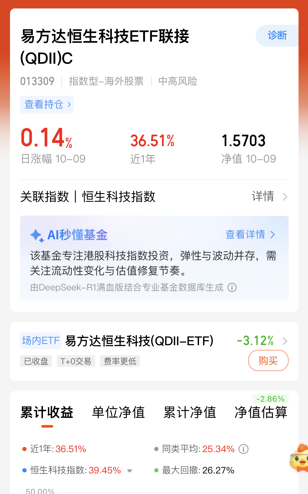 今日港股深度调整,恒生科技虽随之下跌,但横向对比A股、美股,其仍处估值洼地。叠加10月美联储或降息,外资有望回流港股。我继续加仓$易方达恒生科技ETF联接(QDII)C(OTCFUND|013309)$,该基金近三月涨幅21.96%,远超同类平均水平。趁着调整加点仓位,耐心等待恒生科技反弹,把握这一估值与政策双重利好的投资机会。