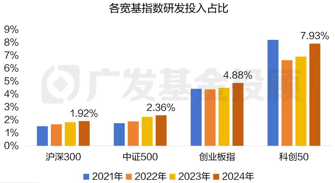 科创板自有一套“硬科技”门槛,其中“研发强度”是核心的科创指标,这也让科创50的研发投入占比,显著高于其他宽基指数(如下图)。