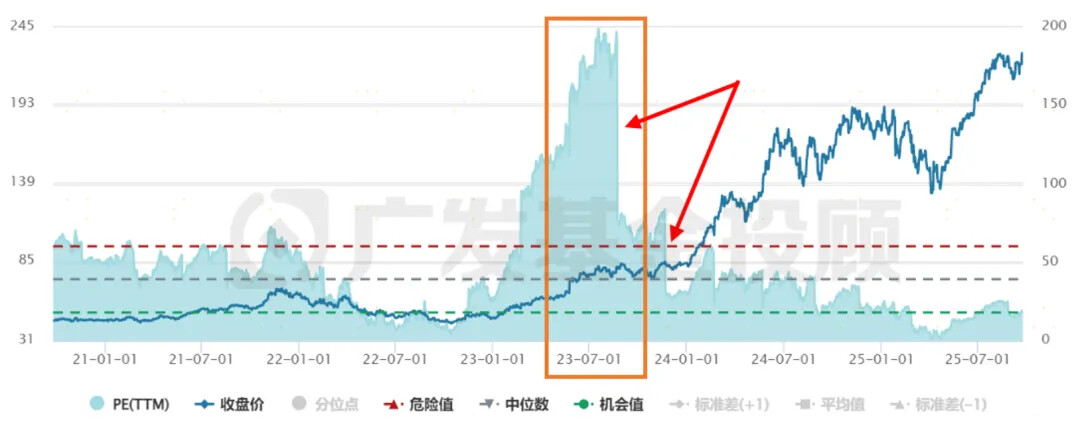 就拿全球科技龙头英伟达来说,2023年年中英伟达也曾经到过200以上的PE(下图中橙色框内)。