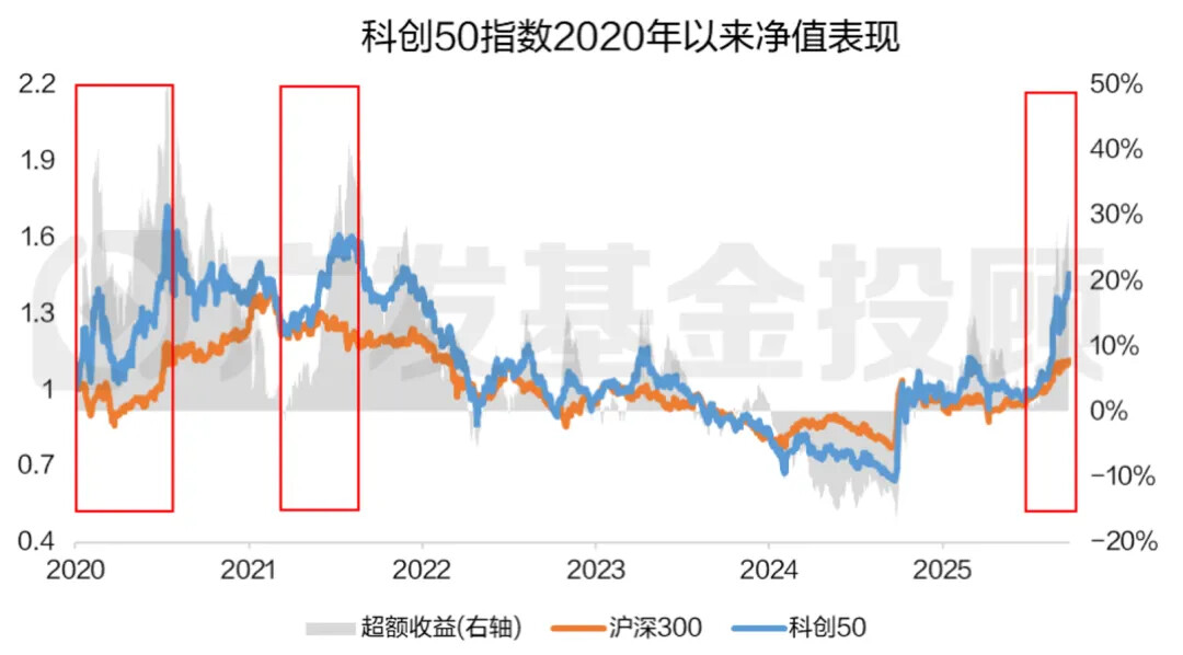 从超额收益来看,科创50在2020年、2021年都有显著跑赢大盘的阶段性行情。