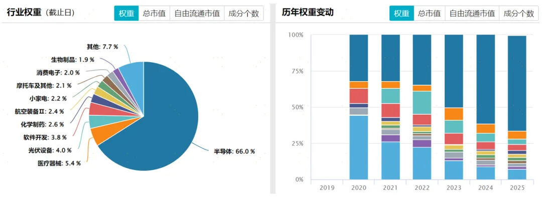 看行业构成,半导体在科创50里可以说是一家独大,单它一个行业就占了约66%的市值,足足三分之二。接下来才是医药、光伏和软件开发。