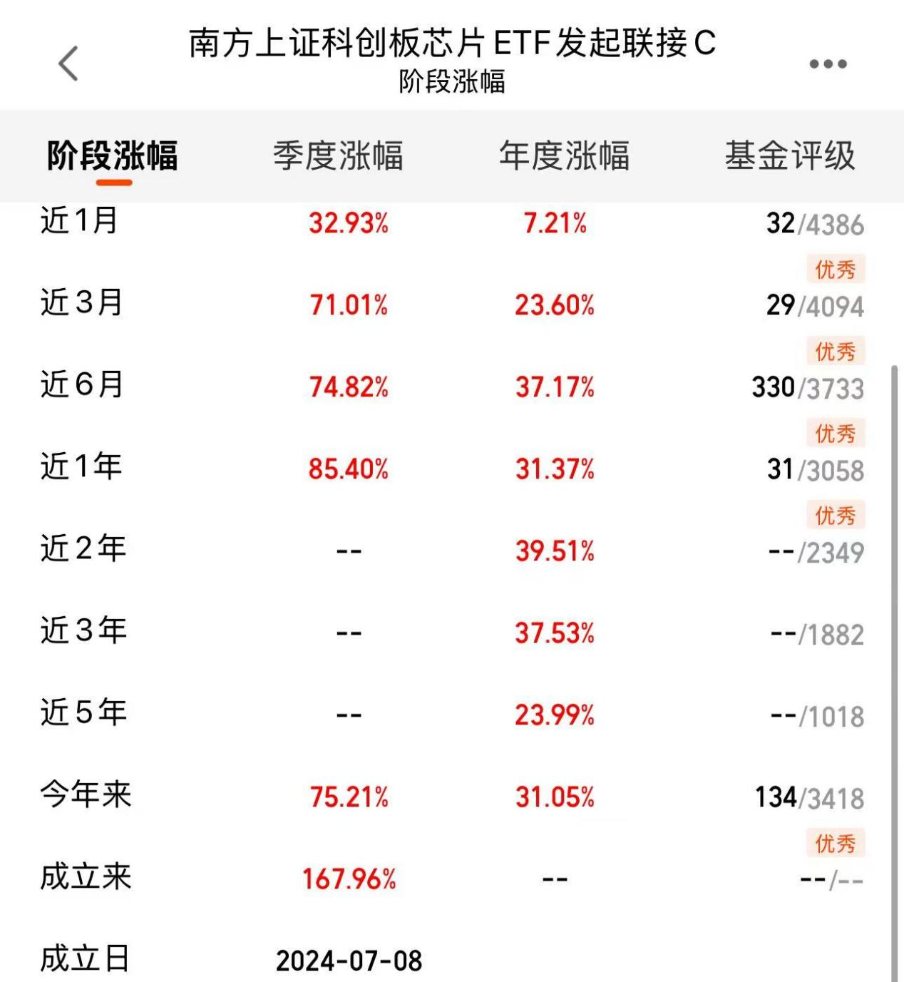 在这种背景下,科创板作为硬科技的聚集地,肯定是资本重点盯着的地方,国产芯片产业链的核心公司基本都在这儿。但对普通投资者来说,直接选个股挺难的——材料、设备、设计这些细分领域景气度差异大,踩错节奏就容易错过机会。所以借道基金打包布局是更稳妥的选择,比如$南方上证科创板芯片ETF发起联接C(OTCFUND|021608)$。这只基金紧紧跟着科创芯片指数(000685),这个指数把半导体产业的材料、设备、设计、制造、封装测试全涵盖了,等于把整个产业链的机会都打包了。而且科创板20%的涨跌幅也让它更有弹性,抓机会的能力更强。业绩上也能拿出手,近1月涨了32.93%,近3月71.01%,近6月74.82%,近1年85.40%,从成立到现在收益已经有167.96%了,不管短期波段还是长期持有,表现都挺亮眼。
