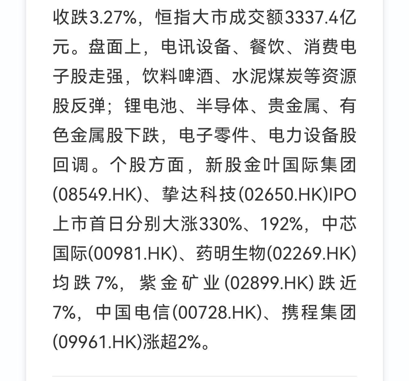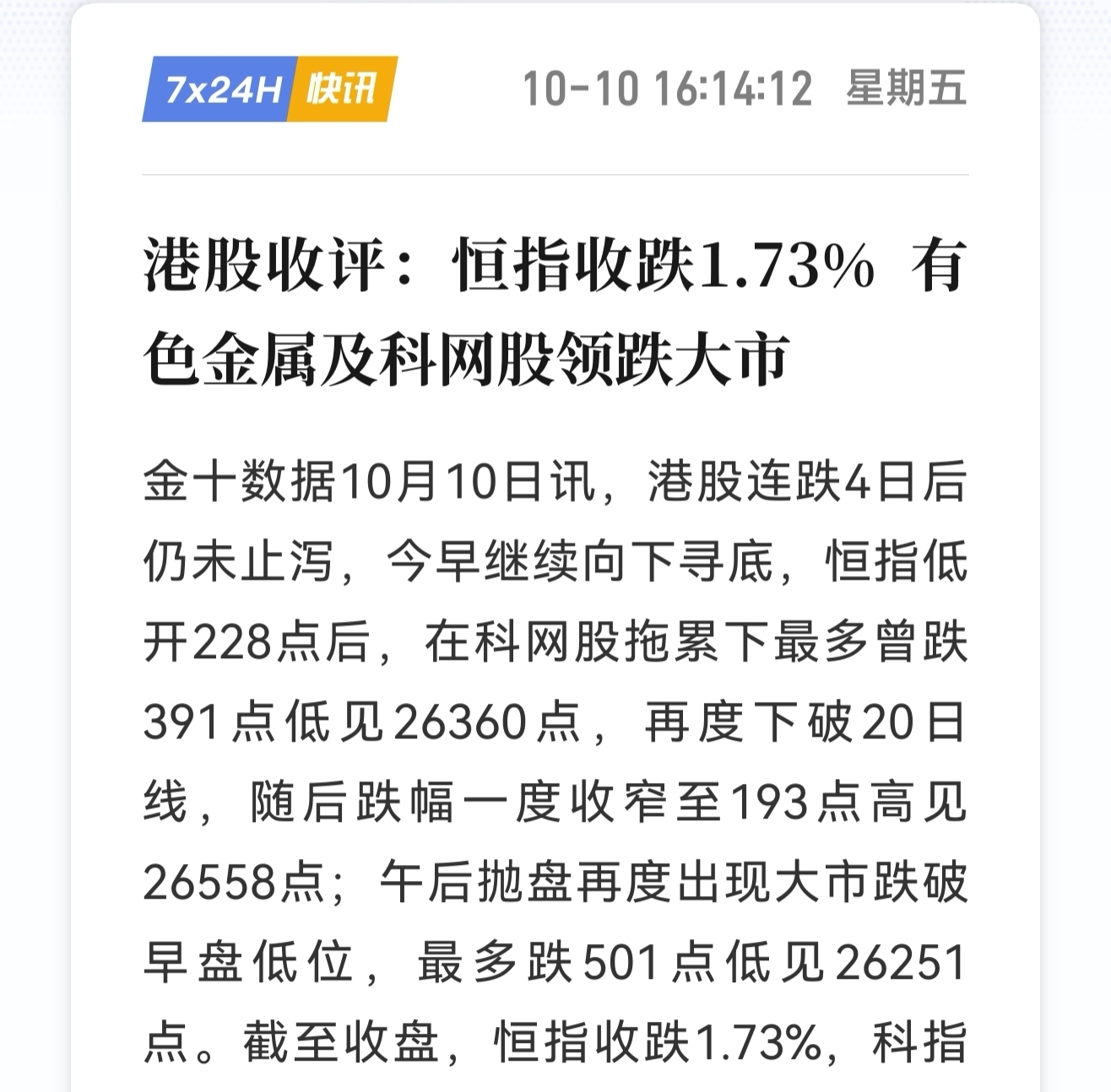 港股收评:恒指收跌1.73%有色金属及科网股领跌大市
