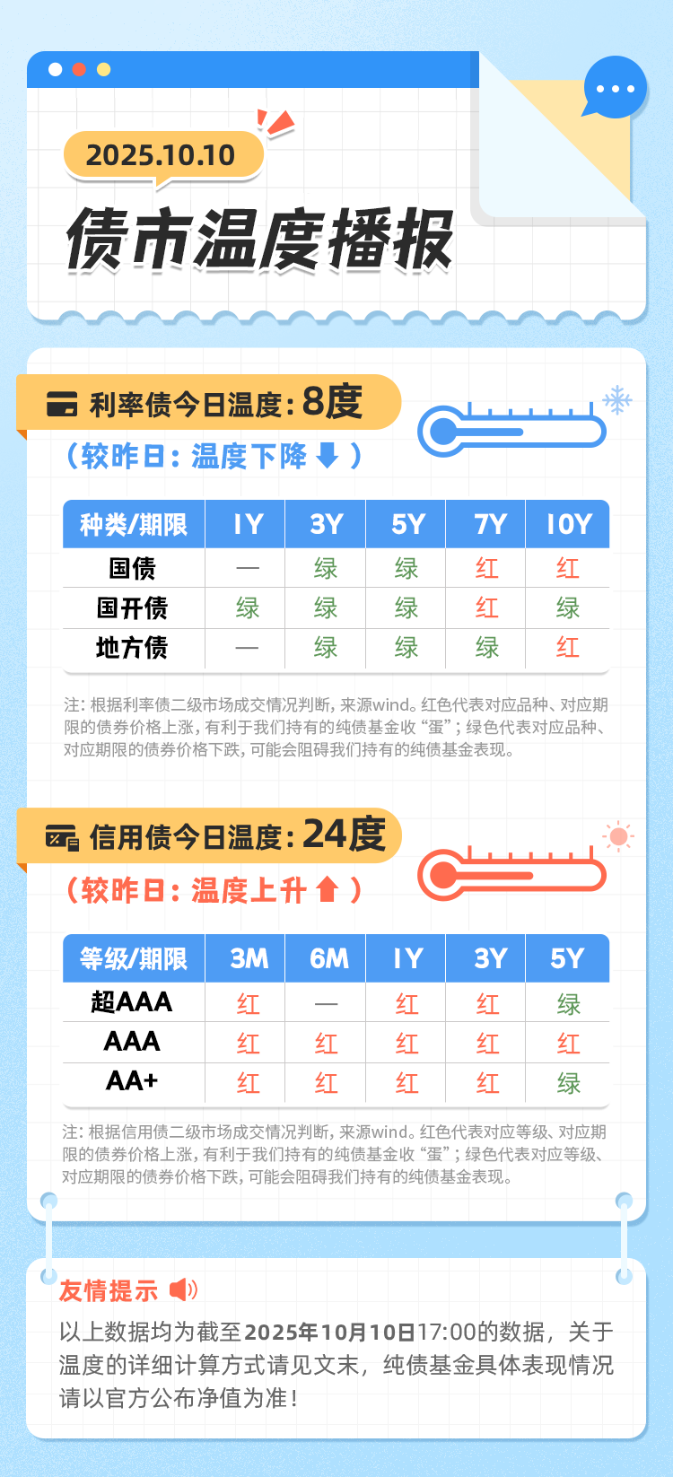 温度设定从0度开始,1个红色格子=温度提升2度。假设当天信用债市场的15格子中,有5个格子是红色,10个格子是绿色,那么当天信用债市场的温度为10度,利率债温度计算同理。
