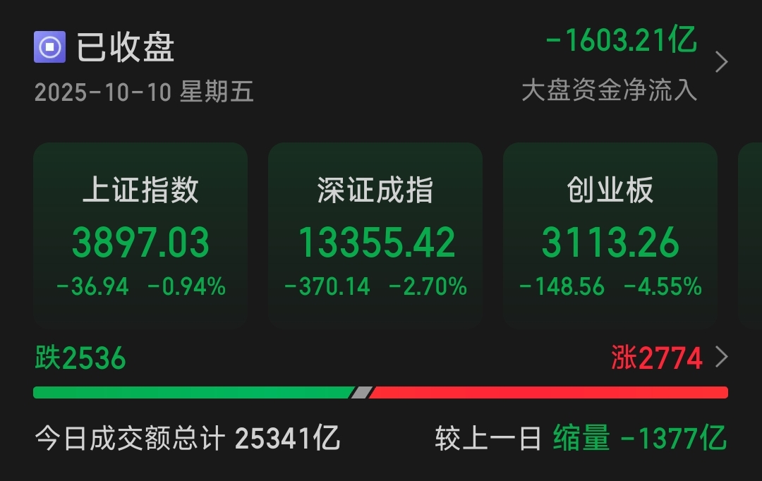 指数表现,沪指跌0.94%,深成指跌2.70%,创业板指跌4.55%。个股上涨略多,全市场2774只个股上涨,下跌个股2536只。沪深京市场全天成交额2.53万亿,较上个交易日缩量1377亿。