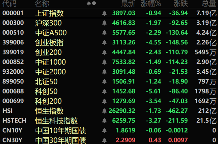 市场全天震荡调整,三大指数集体下跌,沪指跌近1%失守3900点,黄白二线分化明显。沪深两市成交额2.52万亿,较上一个交易日缩量1376亿。