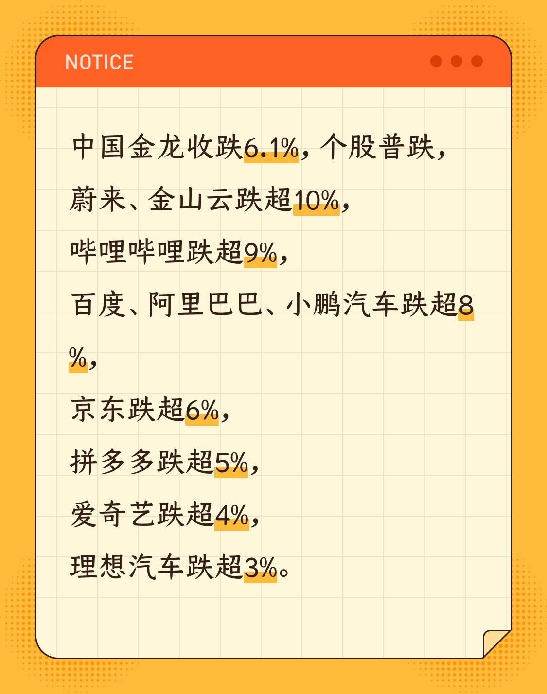 发生了什么?中国金龙大跌6.1%,其中蔚来、金山云跌超10%,哔哩哔哩跌超9%,百度、阿里巴巴、小鹏汽车跌超8%,京东跌超6%,拼多多跌超5%。