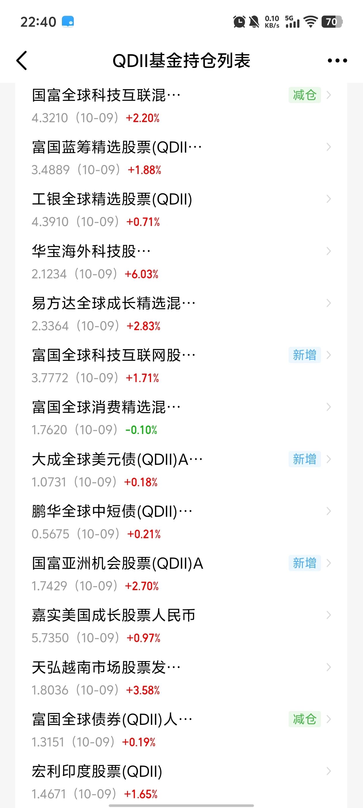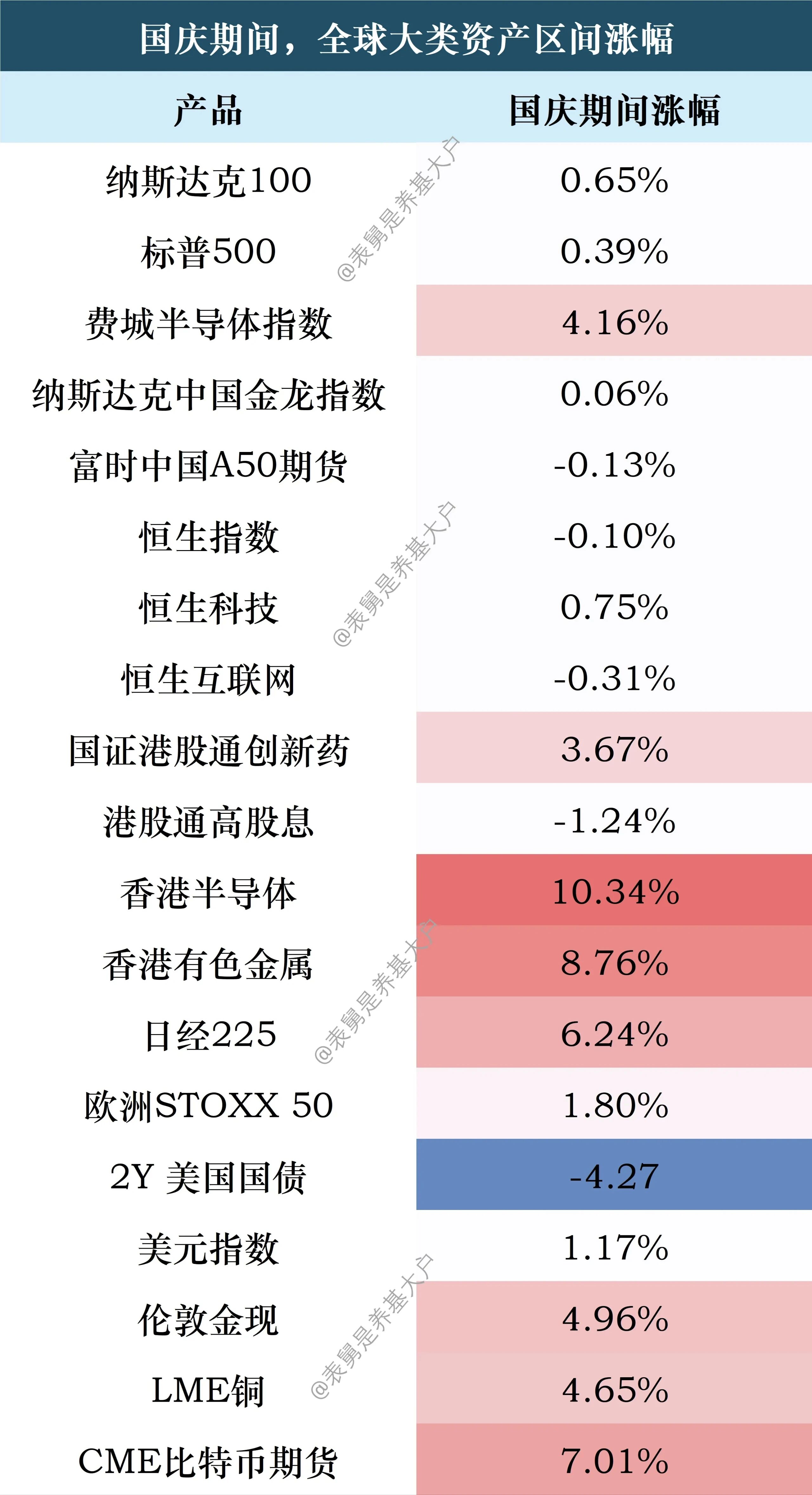 整个十一国庆期间,整体的外围市场的表现还是很好的,比如我们之前提到的关于美股医药市场的大反弹、越南市场的大反弹等等,都是能够如期反映在我们跟投的组合持仓QD基金今晚的净值表现上面的。总体来说,十一国庆节期间表现较好的一些板块,表韭全球都是做了配置的。
