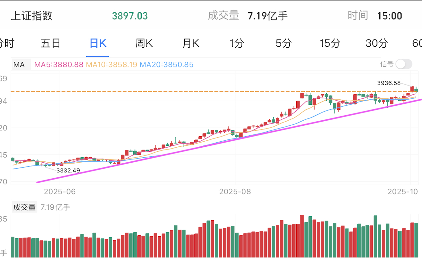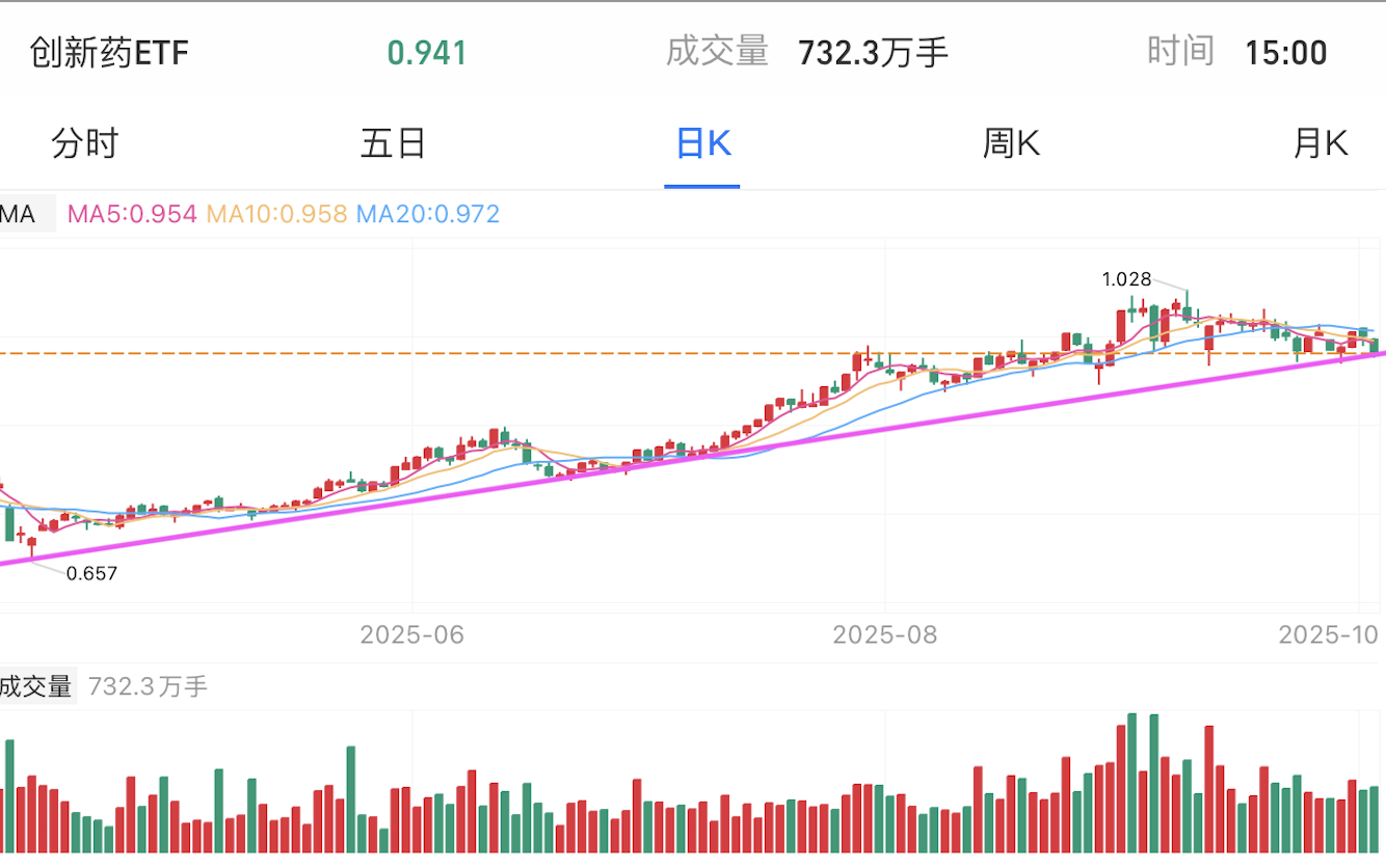 创新药近期大幅上涨,后力竭盘整,最近跌至中长期上涨趋势线附近,如果跌破支撑,那么可能此次行情结束。