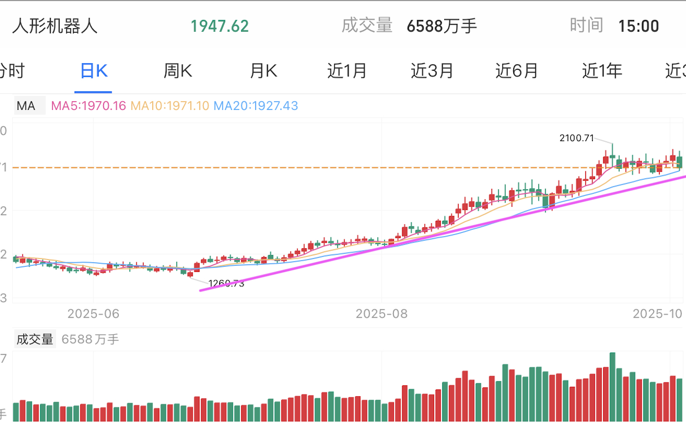 人形机器人近期震荡上行,最近在大幅上涨后回落。前几日涨回压力位,但最终没有突破,再次跌回中长期上涨趋势线,能否守住支撑决定后市走向。