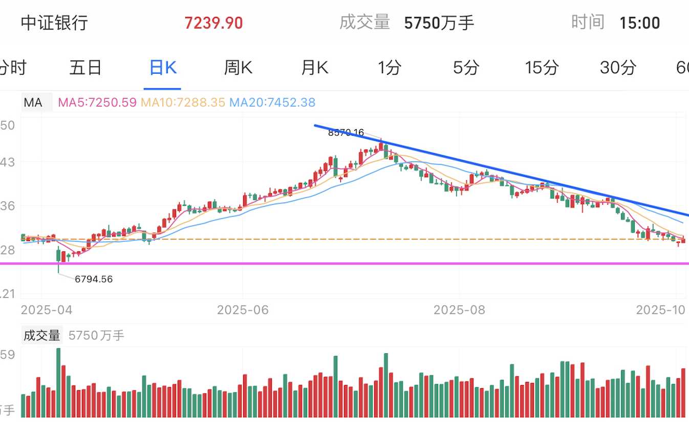 银行近期震荡下行趋势。这几日出现放量上涨,有止跌迹象,但没有突破下跌趋势线,还不能确定就此回升。