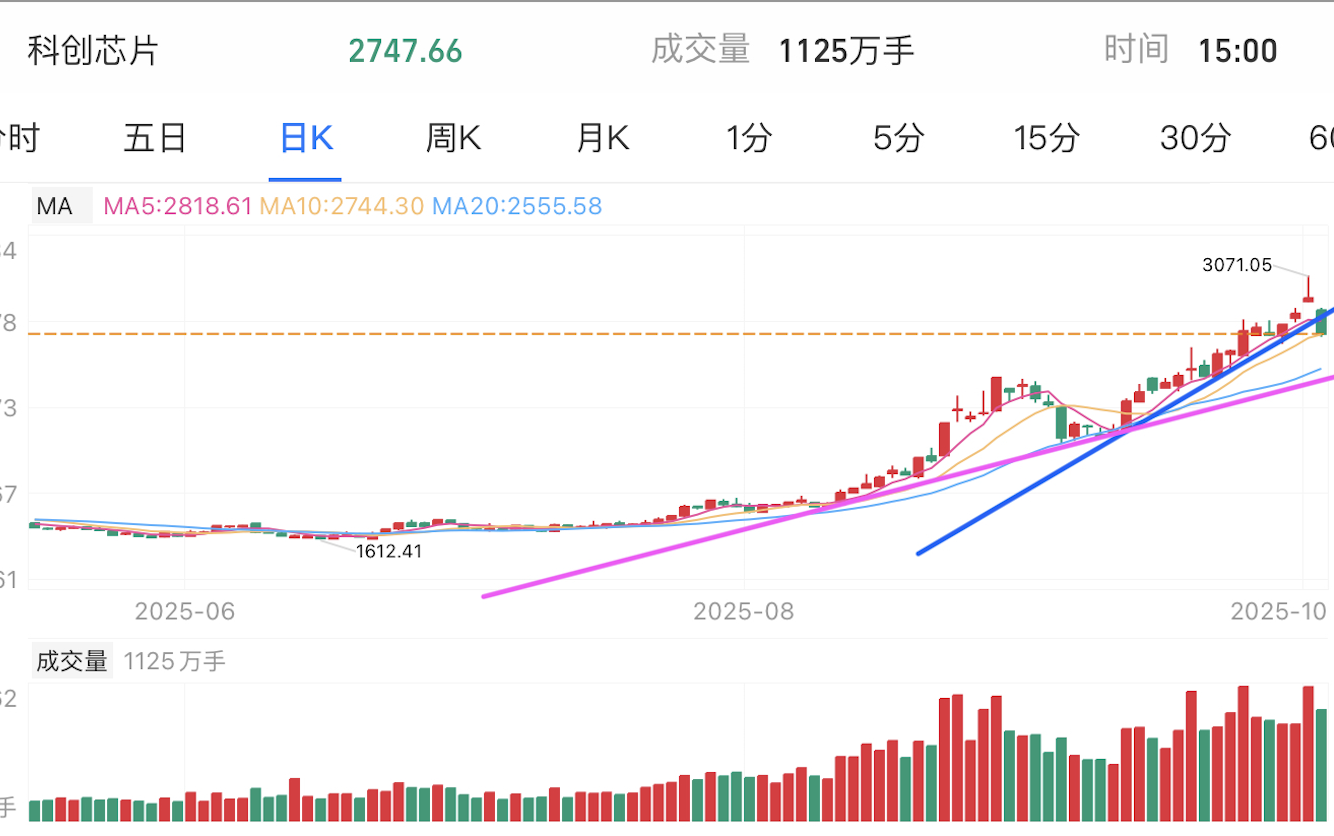 科创芯片周五暴跌,跌破短期上涨趋势线,如果无法快速反弹回来,那么距离下一支撑位有较大下行空间。中长期看,近期一直持续上行,已经有两波行情,目前处于第二段行情结束回调阶段。