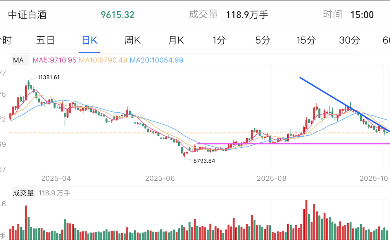 白酒此前在短暂反弹后很快回落,已经跌破前低支撑位,目前震荡下行趋势,逐渐靠近前低支撑位和最低点强支撑位。