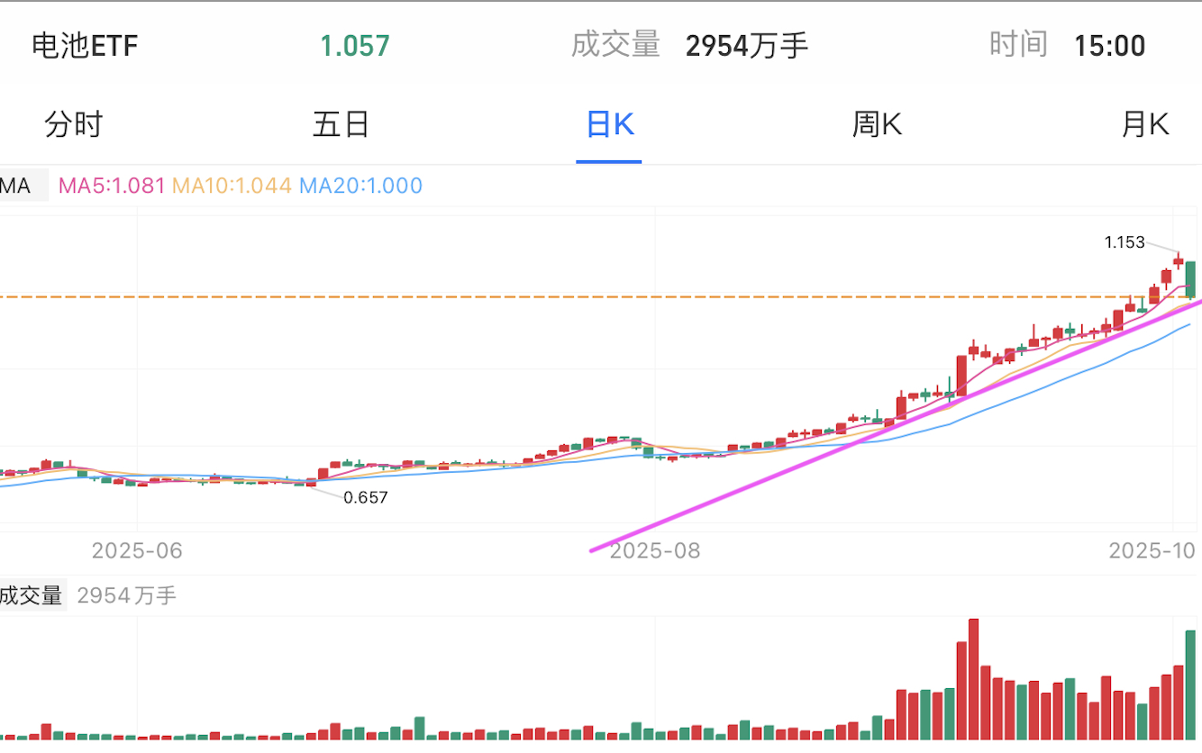 电池近期有一波上涨,在前几日大幅拉升后,周五大幅下跌伴随放量,虽然没有跌破上涨趋势线,但交易量和跌幅过大,后市下行风险加大。