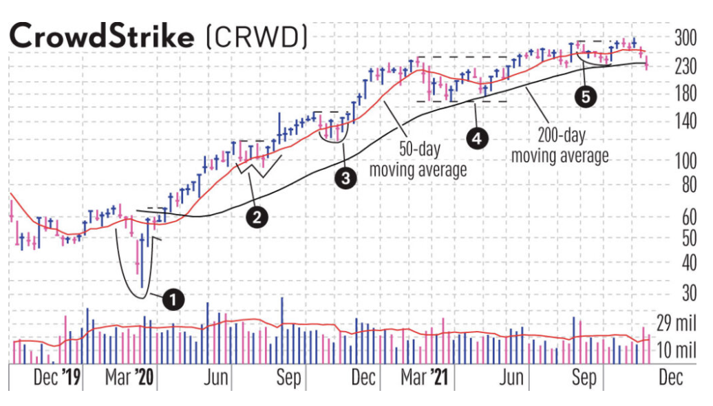 以网络安全公司CrowdStrike(CRWD)为例,其在2020年新冠疫情后的牛市中表现突出,展示了典型的基底形成和上涨周期: