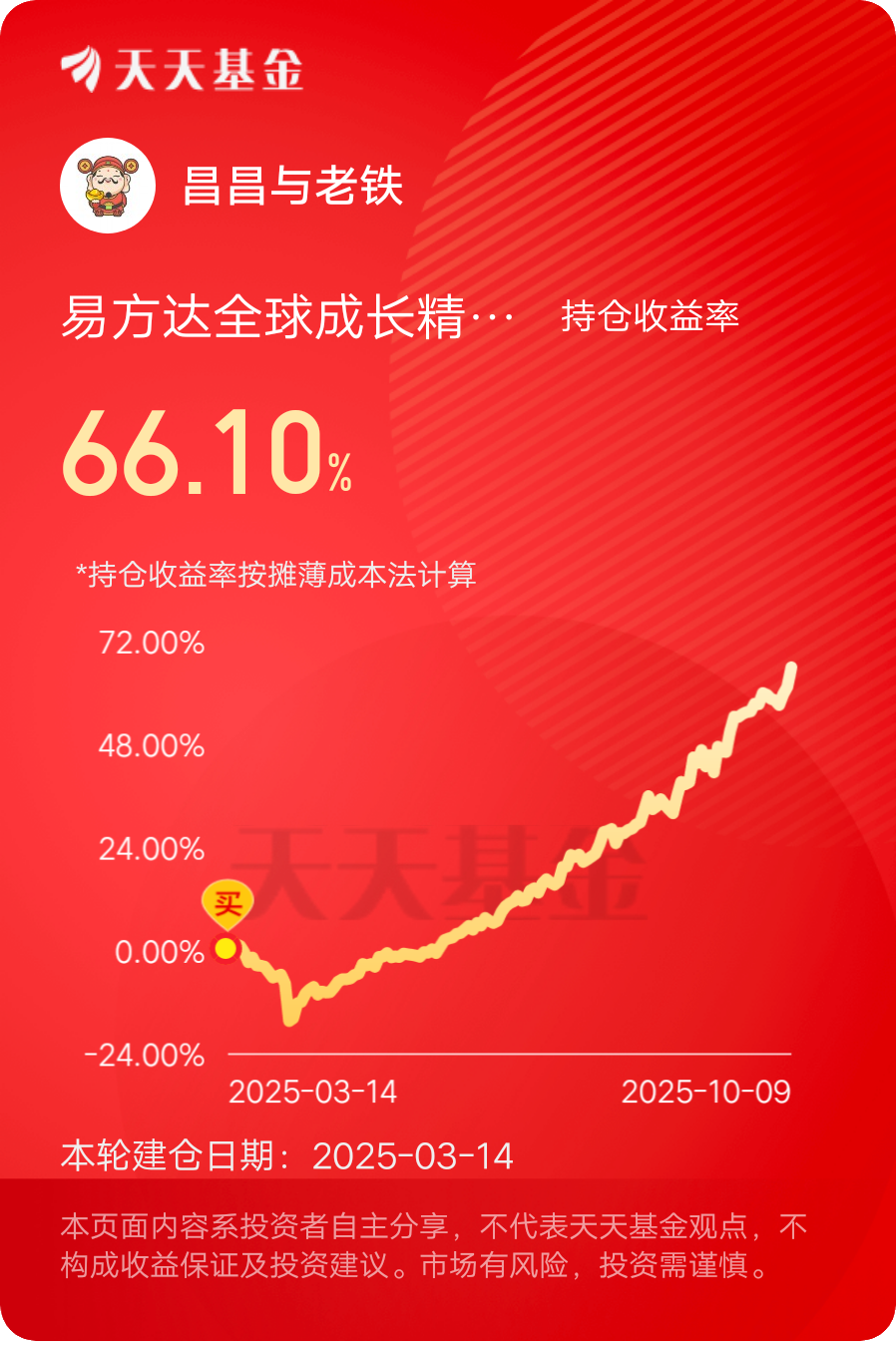 四季度我打算继续持有这只基金,一方面看好其覆盖的海外优质科技和消费企业,另一方面C类份额免申购费、仅收销售服务费,短期持有成本更低。后续会密切关注全球经济数据,若出现大幅波动再考虑调整仓位,争取为2025年投资画上圆满句号。$易方达全球成长精选混合(QDII)人民币C$ #晒收益#