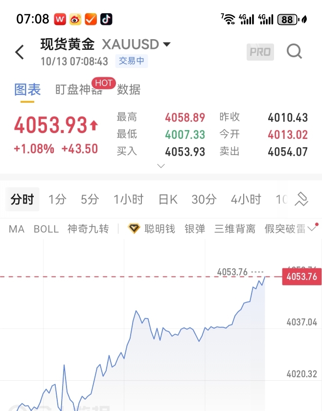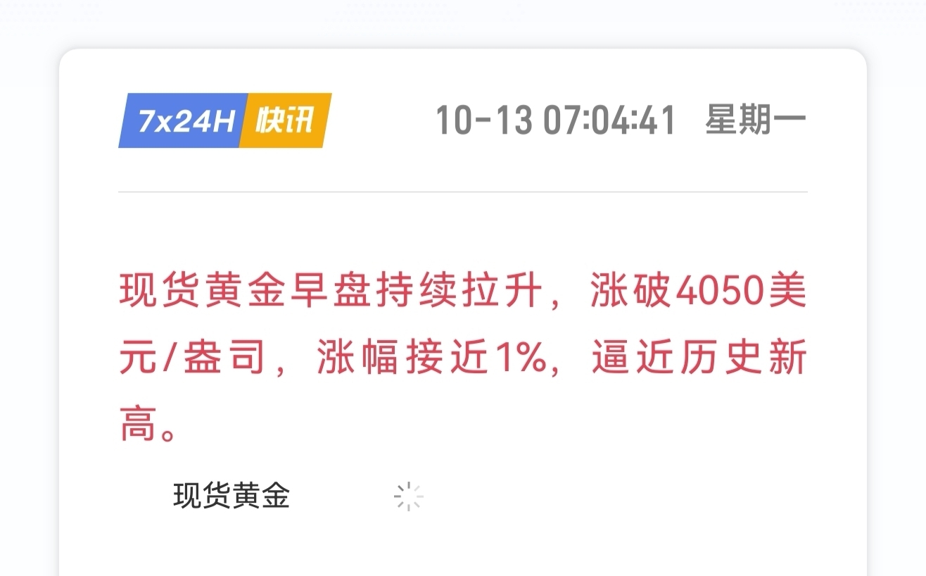 现货黄金早盘持续拉升,涨破4050美元/盎司,涨幅接近1%,逼近历史新高。