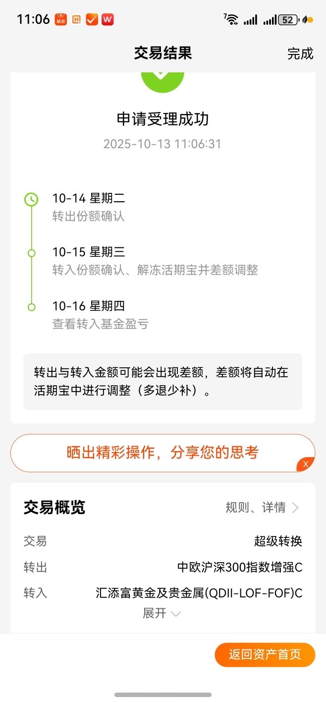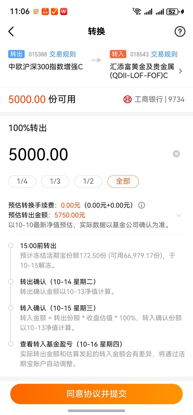 在今天,也考虑选择把持有某个沪深300指数基金持有份额中,早就已经超过7天的剩余5000份额资金,在今天,也给考虑选择调仓转到目前持有的某个黄金及贵金属qll基金了。
