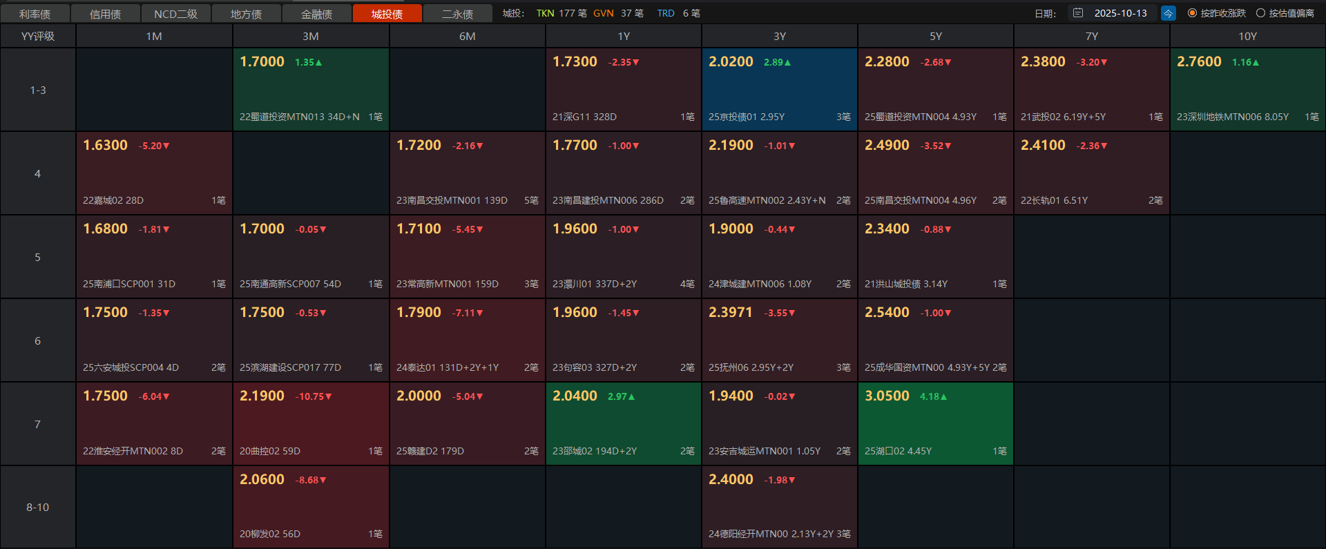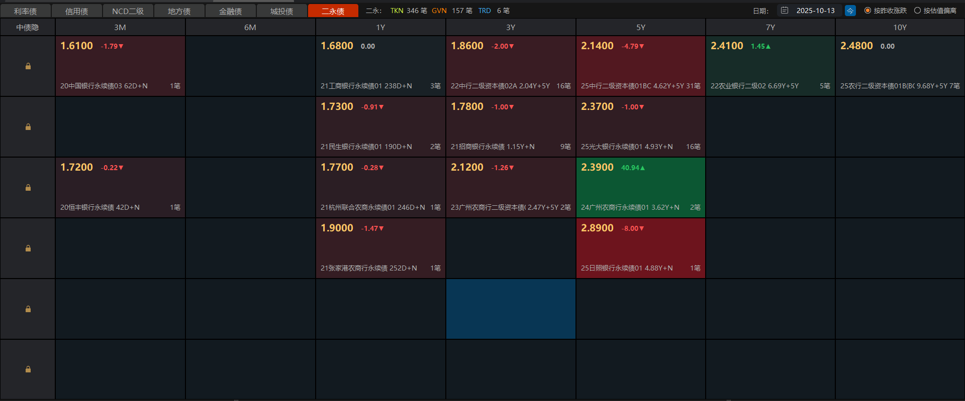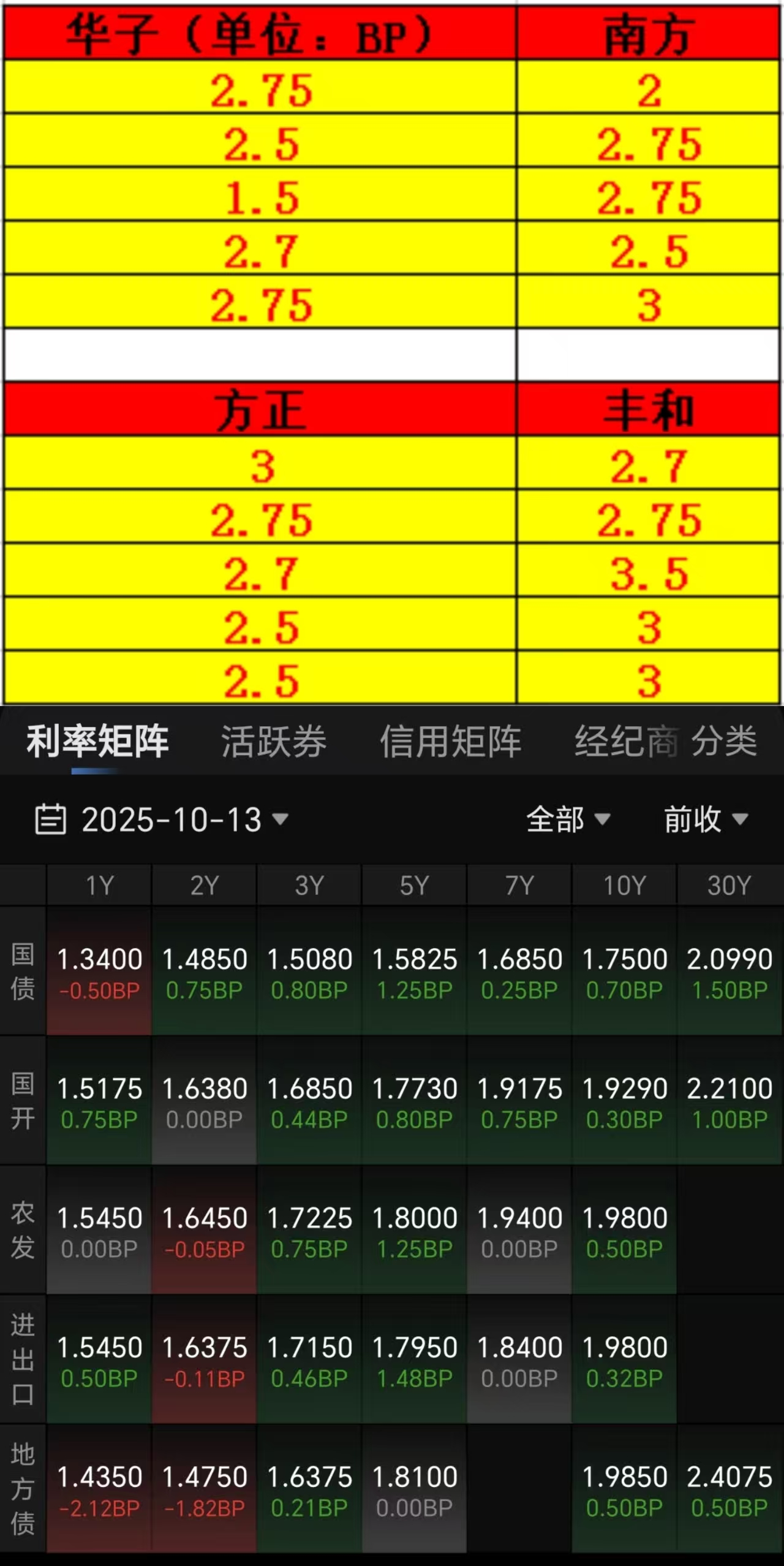10月13日债市午间天气播报:上半场隔壁大盘震荡洗盘ing,稀土领涨,有色金属回落小跌,科创芯片抱团取暖,抄底抄早了,冲高又回落了。个股表现依然不佳,四千多家下跌。债市这边,叠加上周六存量,利率债7-10年国开债收蛋21-25个左右,超长期国债收蛋40-65个蛋(华子和方正)。信用债这边城投债表现较好,7年期银行债小跌。