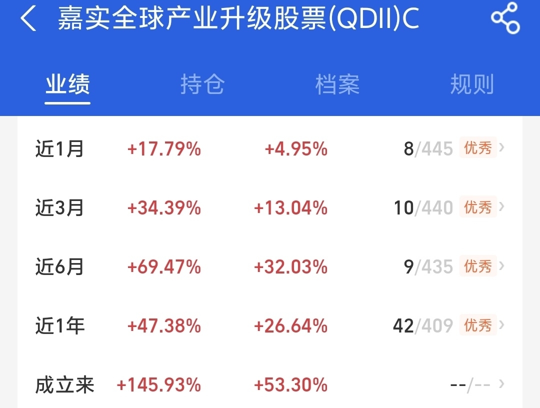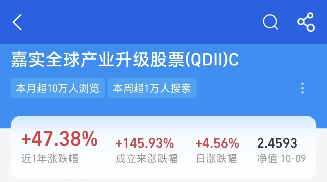 ,美股虽然调整了,不过总体还是稳步上升的。我的$嘉实全球产业升级股票发起式(QDII)C$ 布局的都是高景气领域,全球资金更爱往科技等高景气领域流。 它专投全球产业升级赛道,重仓英伟达、新思科技等半导体龙头,股票持仓占比超86%,精准捕捉AI算力、半导体这些热门机会。从业绩上来看,近一年涨了47.38%,成立以来直接涨超145%,在同类中表现亮眼,近一年胜率更是高达85%,稳定跑赢大盘。 国庆期间还悄悄涨了4.56%,不少人都赚了不少。现在全球利率下行,科技产业又在爆发期,这只基我很看好,我打算长期稳稳拿着。 $广发纳斯达克100ETF联接人民币(QDII)C$ $天弘标普500发起(QDII-FOF)C$