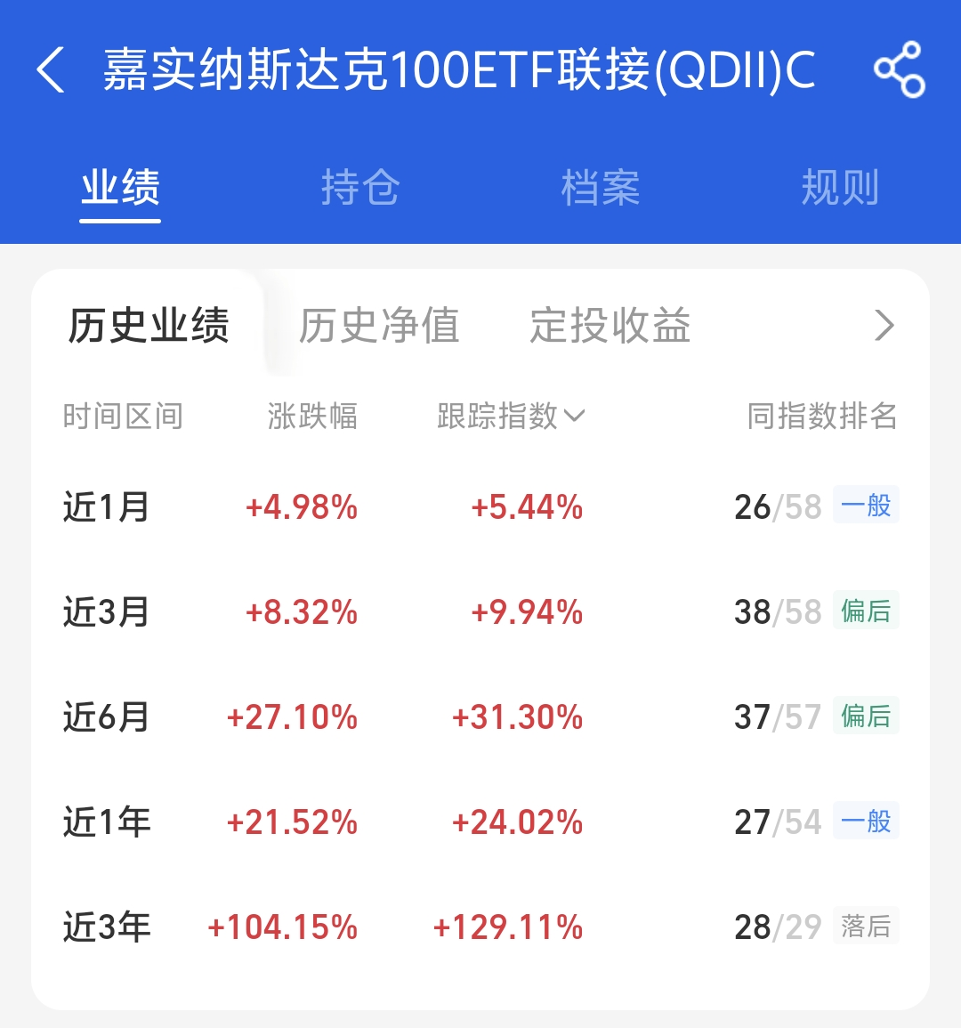 后来自己就选了$嘉实纳斯达克100ETF发起联接(QDII)C人民币$ ,想着不用费心去挑单个公司,跟着这个指数就能沾到全球科技成长的光。毕竟这么多年看下来,这些科技龙头的韧性和潜力还是挺让人有信心的。