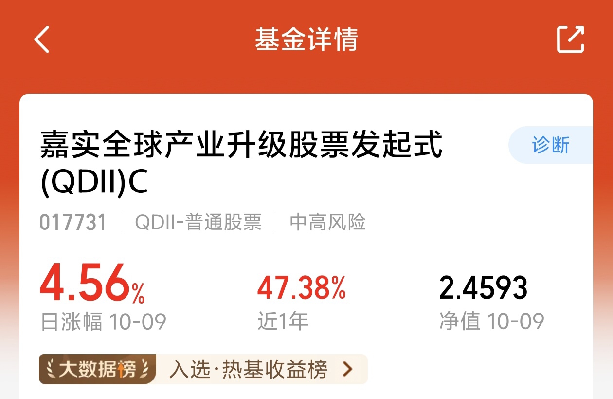 随着关税问题,行情有所回落,也是逢低布局的机会。$嘉实全球产业升级股票发起式(QDII)C$ 上周五单日上涨了4.56%,近六个月的收益率高达69.47%,盈利能力强。 受国产大模型突破驱动,算力、智能驾驶成布局核心,量化资金对 AI 板块净买入力度显著。