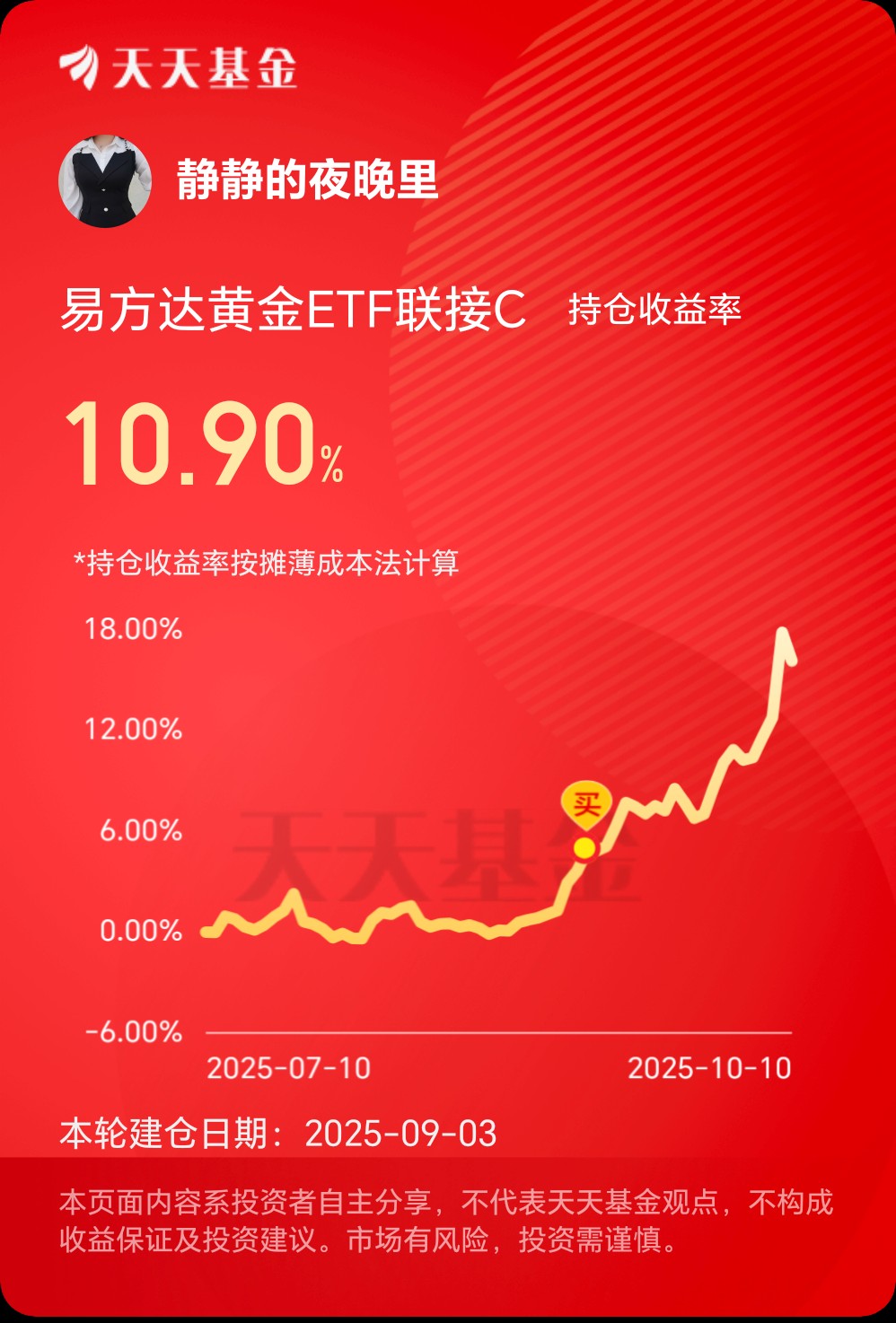 最近全球市场都呈现震荡局面,特别是在关税不确定性冲击之下,市场避险情绪明显升温,黄金避险价值也在凸显,而我持有的$易方达黄金ETF联接C(OTCFUND|002963)$近期收益率却是突飞猛进,目前我的持有收益率为10.9%,近一年涨超48.84%,远超同类平均水平,而从中长期来看,全球地缘政治风险等因素也在持续存在,这也将进一步推动黄金走出独立行情,我也准备继续定投起来了!
