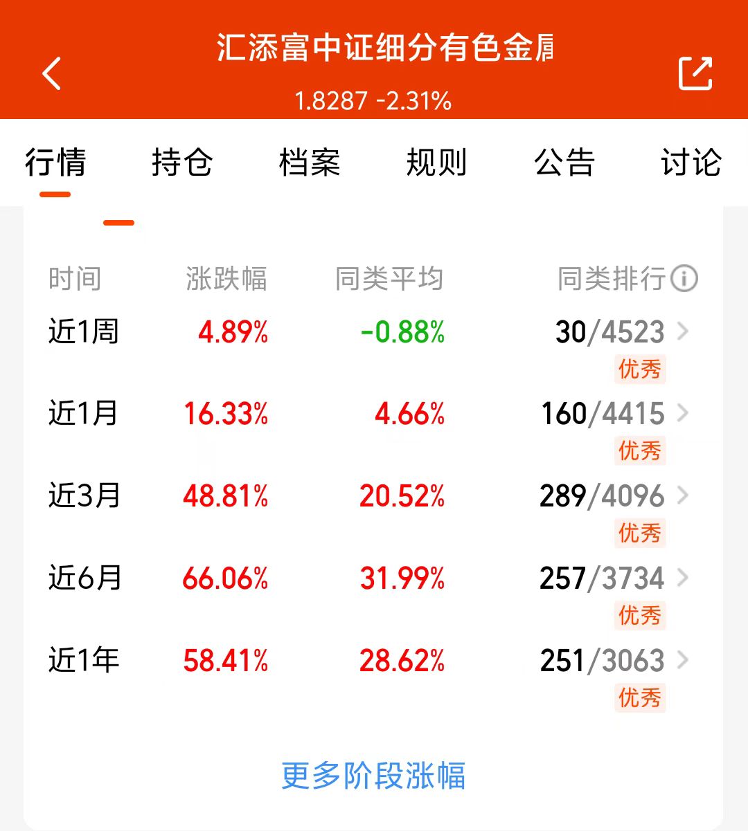 大盘今天震荡调整,三大指数跌了不少,有色金属近期表现还不错,$汇添富中证细分有色金属产业主题ETF发起式联接C(OTCFUND|019165)$含铜量30%,黄金含量14%,显著高于同类有色金属,前五大权重股占比37%,前十大权重股占比52%,成分股集中度中等偏高,持仓覆盖了紫金矿业、北方稀土、洛阳钼业、华友钴业、中国铝业等龙头资源企业,涵盖了铜、稀土、锂、铝等核心领域