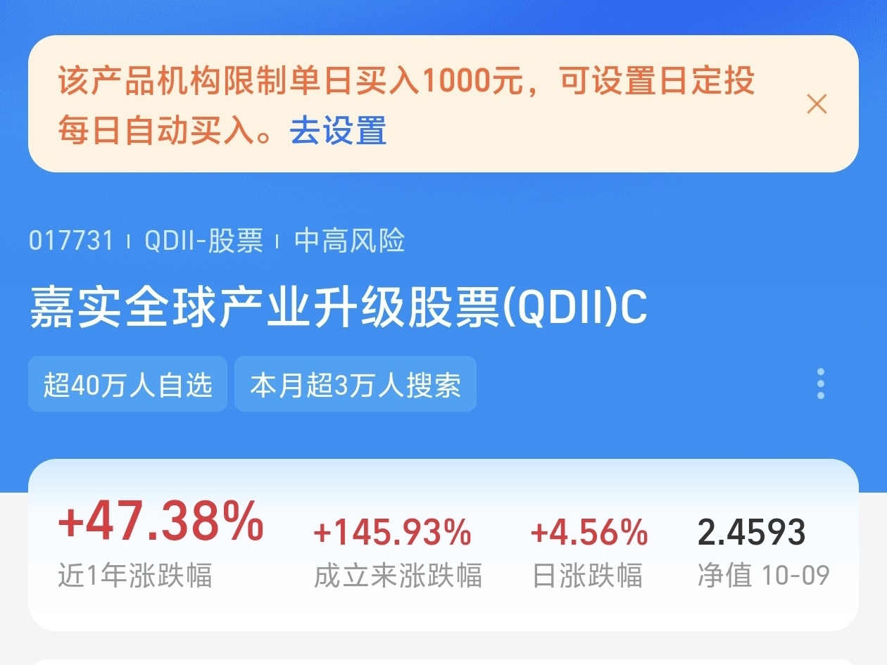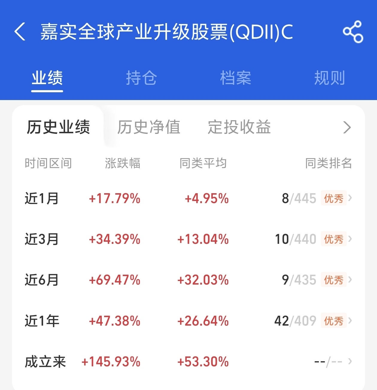 今天的行情有所回落,也是逢低布局的机会投资性价比高。$嘉实全球产业升级股票发起式(QDII)C$ 上周五单日上涨了4.56%,近六个月的收益率高达69.47%,AI 数据中心带火电力需求,拥有燃气、核电资产的发电商受捧,相关基金兼具攻防性。