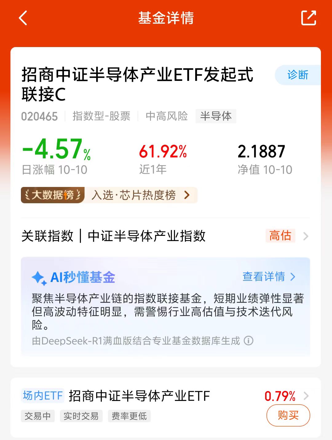 大盘今天回调了,半导体板块表现还不错,逆势上涨,盘中涨幅接近2%,自主可控利好,四季度我还是比较看好半导体板块的,$招商中证半导体产业ETF发起式联接C(OTCFUND|020465)$近一月涨了24.38%,近三个月涨了51.37%,业绩还不错,半导体板块近期利好消息不断,发展前景很不错,看好这个方向,我准备分批加仓了!