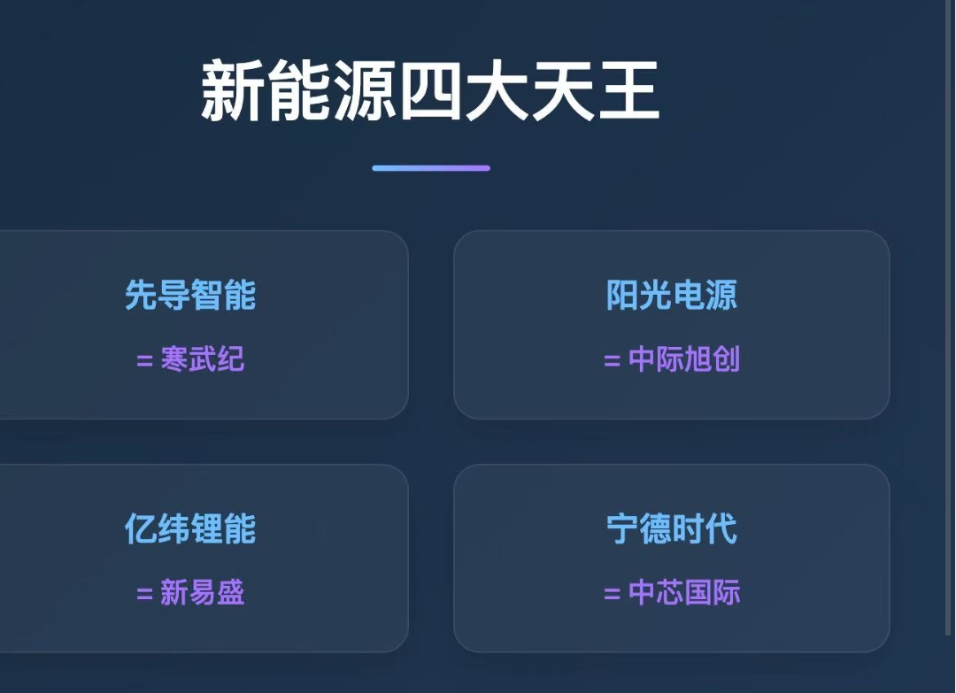 老美的科技制裁和关税威胁,虽然短期造成科技、新能源等板块回调,但冲击有限,今天芯片更是逆势上涨,凸显自主可控的重要性。现在的电池就是前期的芯片和CPO,新能源四大天王:宁德时代、阳光电源、亿纬锂能、先导智能。