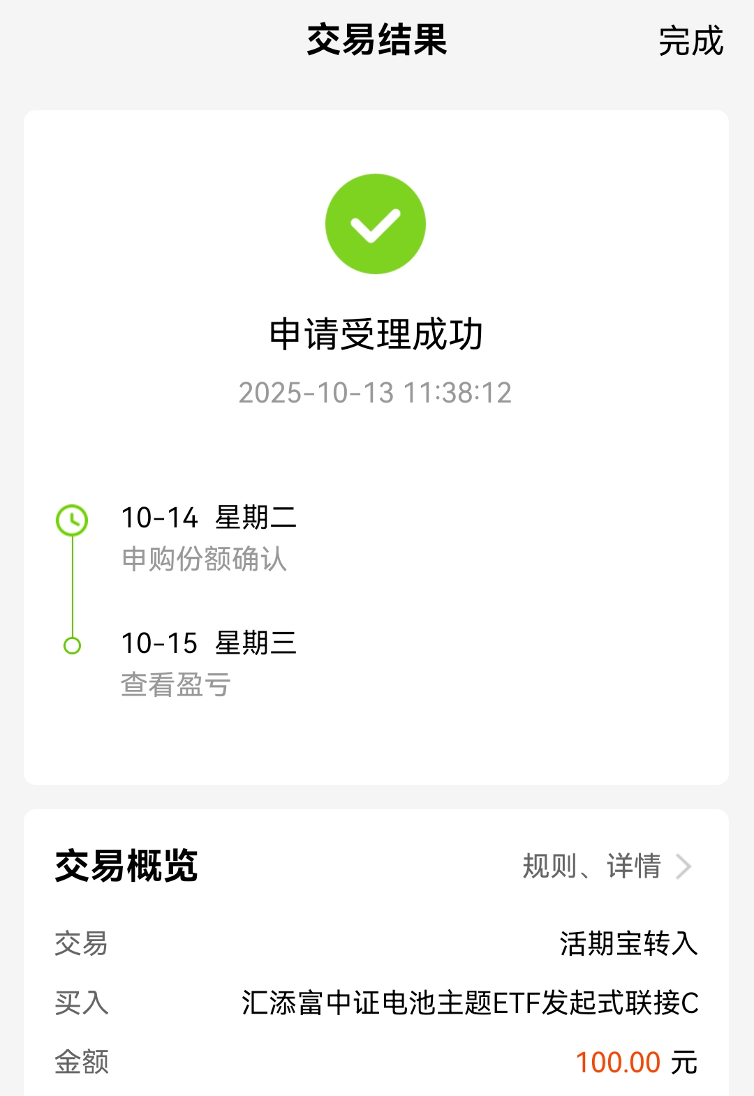 $汇添富中证电池主题ETF发起式联接C(OTCFUND|012863)$持股更集中,阳光电源含量最高(占比15%),锐度高,更有弹性,我选择定投它,还看中它的综合费率低(仅0.45%),在长期配置下更具性价比。相信在规范出口、反内卷下,电池板块的发展会更健康回归!