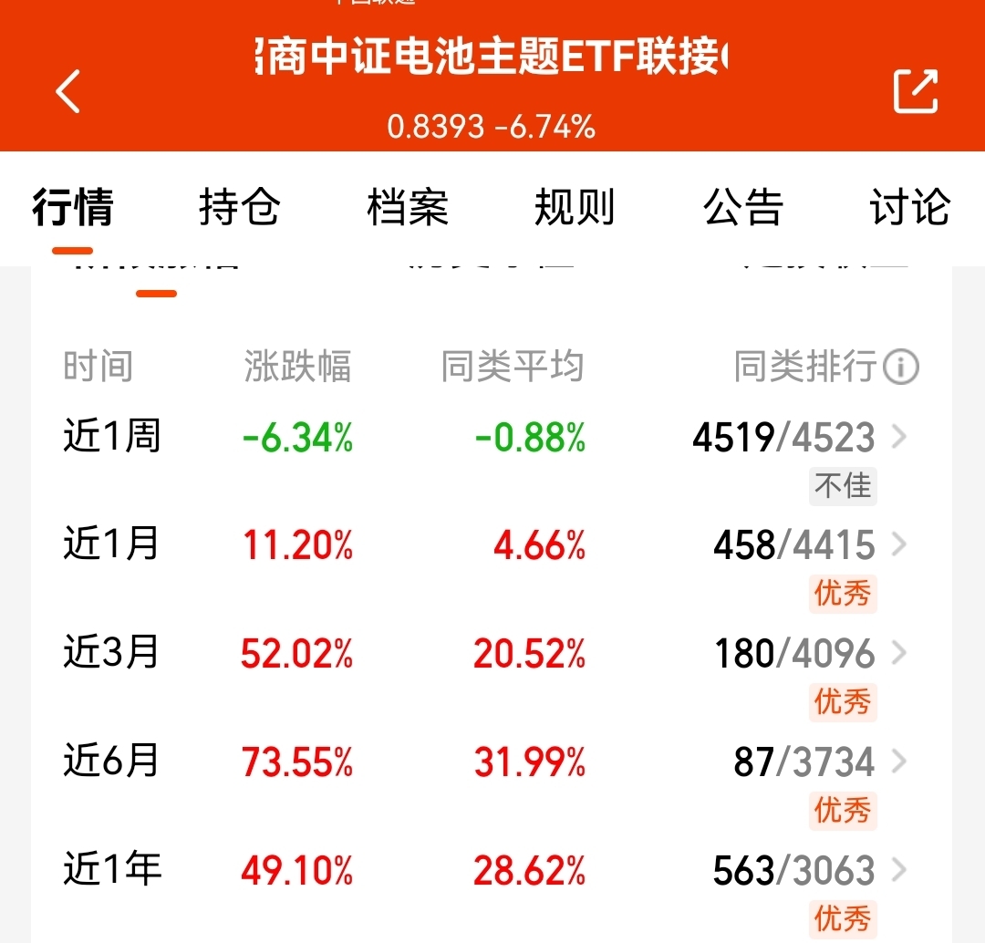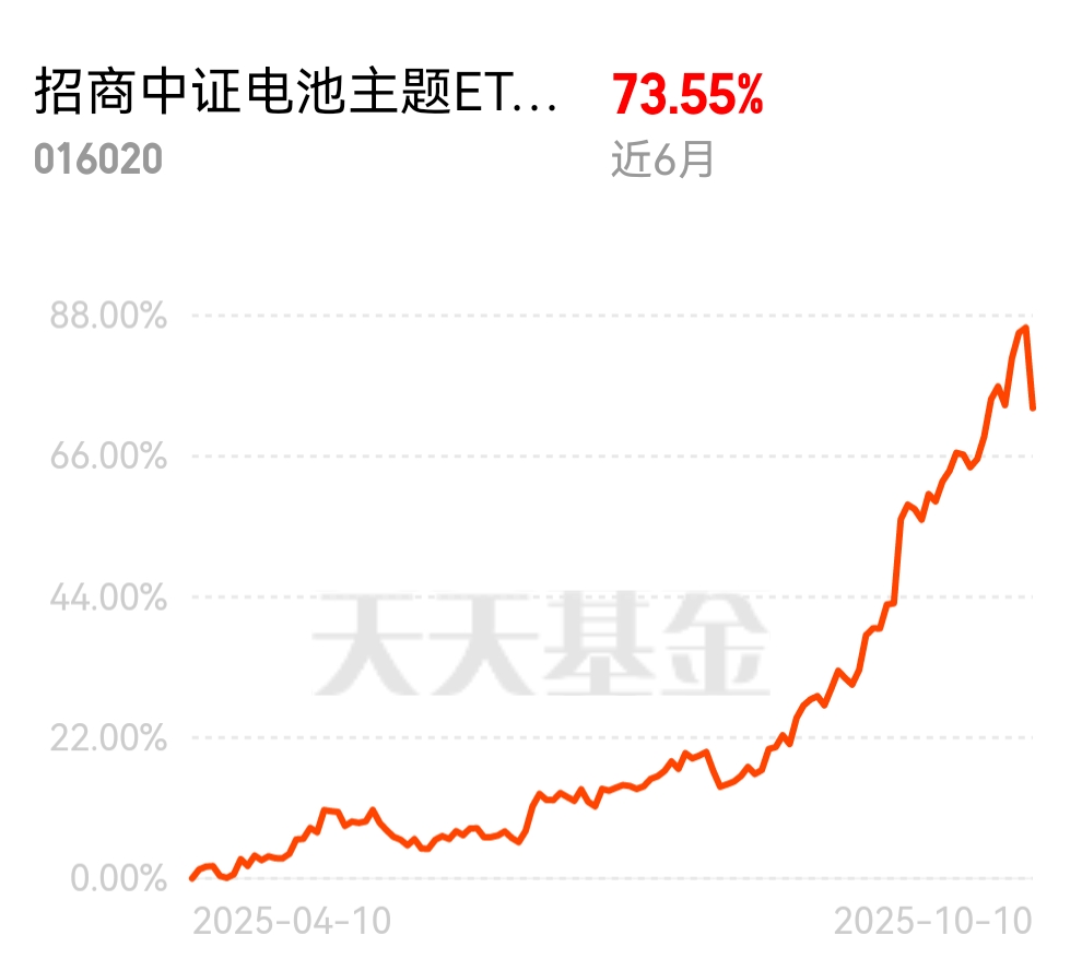 调整反倒是很好的机会,我比较看好这支$招商中证电池主题ETF联接C$ ,跟踪电池板块,近1个月涨了11.20%,近半年收益已经有73.55%,明显有主线趋势,跑赢大多数板块了;