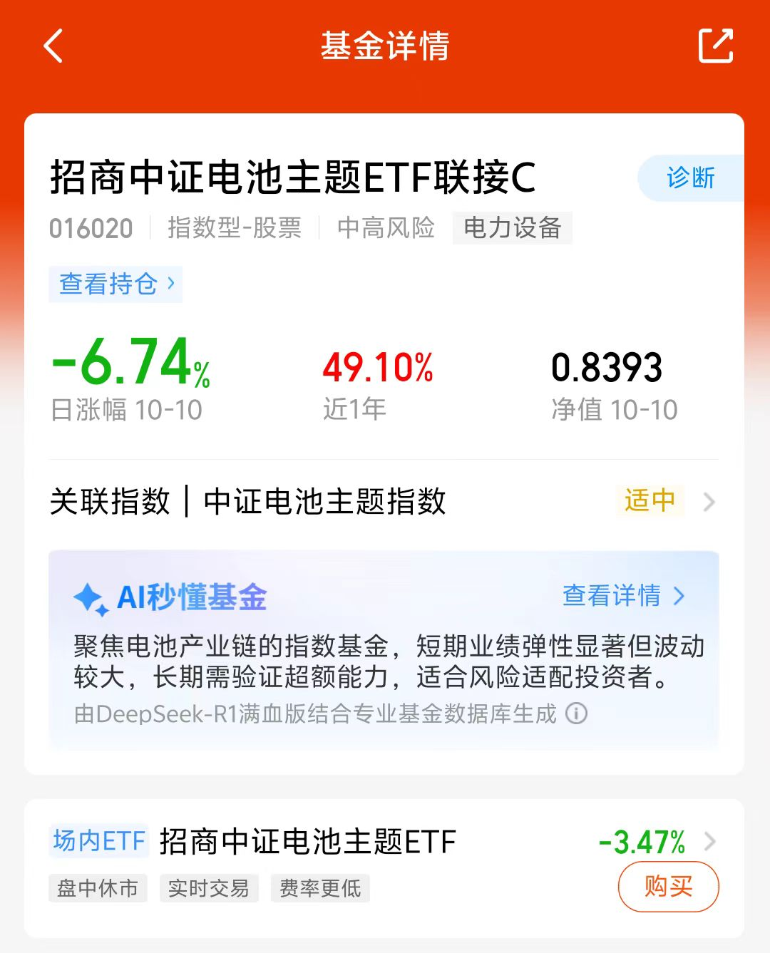 大盘今天震荡调整,电池板块今天回调了,锂电板块短期受出口管制错杀,实质影响较小,资金你是加仓电池板块,长期来看,储能需求超预期加速供需拐点到来,继续推荐电池及各环节龙头,出口限制海外电池厂产业链,有望进一步增强我国电池厂竞争力!$招商中证电池主题ETF联接C(OTCFUND|016020)$近一月涨了11.20%,近三个月涨了52.02%,长期看好这个方向,我准备分批加仓了!