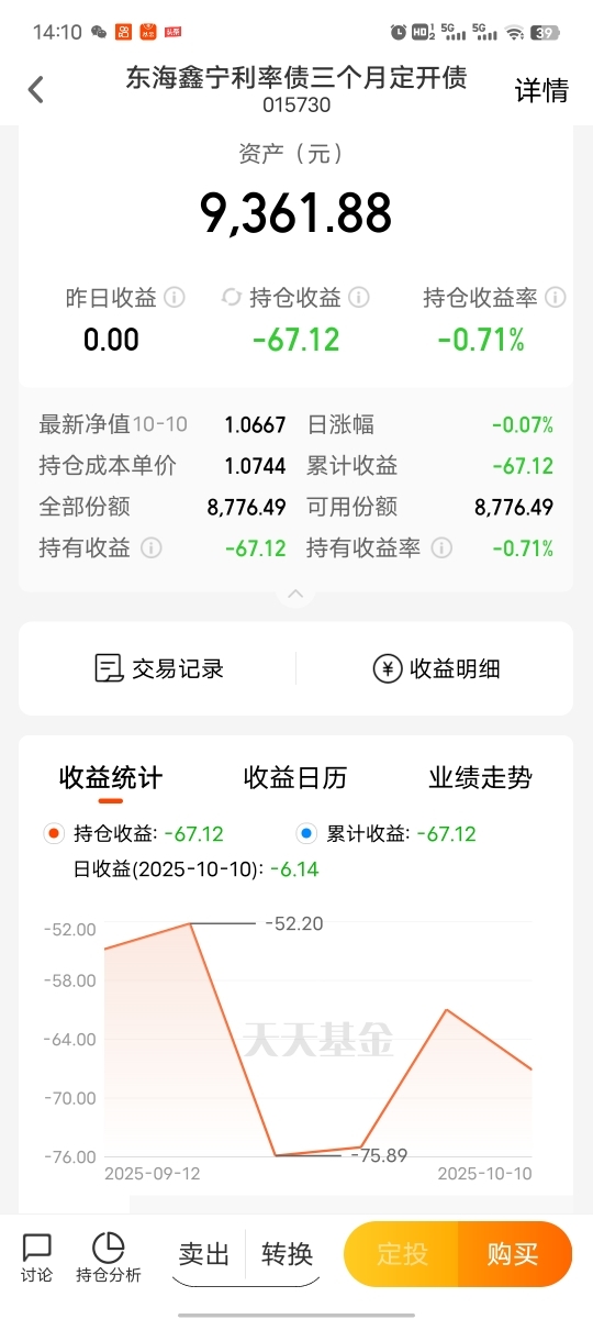 拿了7个月亏损67元,止损了,利率债比例要降降,风险太大