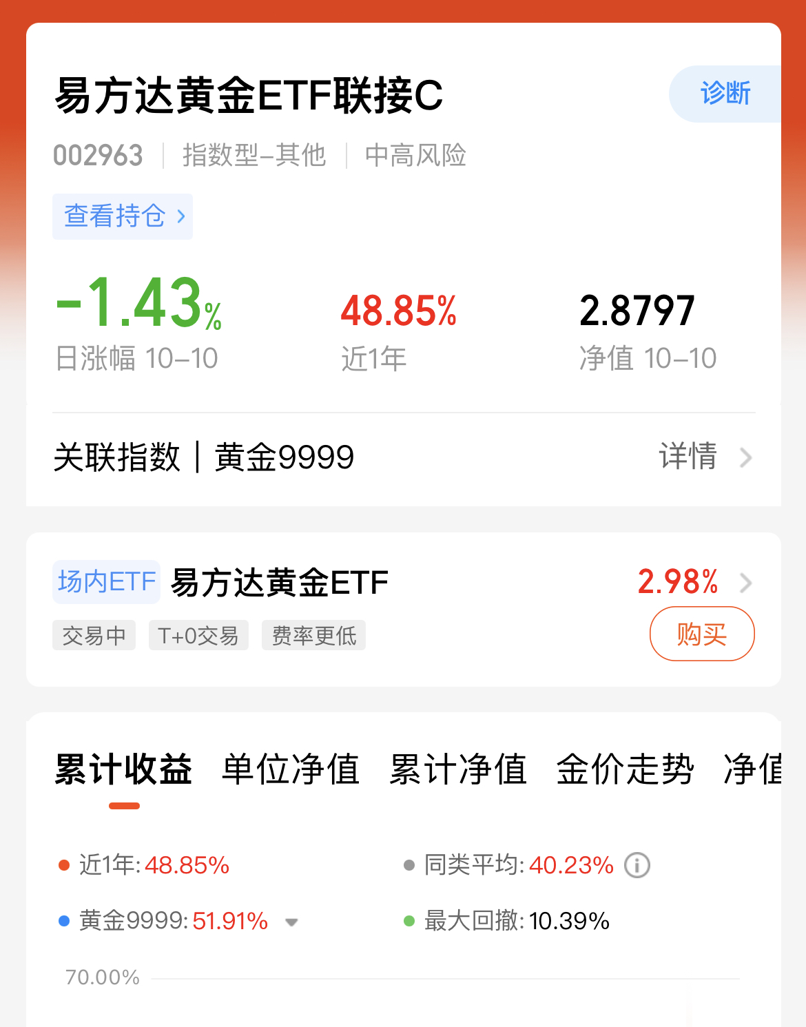 今日大盘震荡加剧,黄金却在短暂调整后再创新高,避险价值凸显。我打算继续补仓$易方达黄金ETF联接C(OTCFUND|002963)$:这只基金近期业绩亮眼,完美契合当前中美博弈升级下的避险需求。全球市场波动还在持续,黄金的独立行情逻辑扎实,加仓既能跟上上涨趋势,也能让持仓多一层避险缓冲,后续打算继续跟紧节奏。