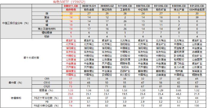 风险提示:基金有风险,投资需谨慎。投资人应当阅读《基金合同》《招募说明书》《产品资料概要》等法律文件,了解基金的风险收益特征,特别是特有风险,并根据自身投资目的、投资经验、资产状况等判断是否和自身风险承受能力相适应。基金管理人承诺以诚实信用、谨慎尽责的原则管理和运用基金资产,但不保证基金一定盈利或本金不受损失。以上基金属于中等风险等级(R3)产品,适合经客户风险承受等级测评后结果为平衡型(C3)及以上的投资者。请投资者关注指数化投资的风险以及集中投资于细分有色指数成分股的持有风险,请关注部分指数成分股权重较大、集中度较高的风险,请关注指数化投资的风险、ETF运作风险、投资特定品种的特有风险等。文中提及个股仅为指数成份股客观展示列举,本文出现信息只作为参考,投资人须对任何自主决定的投资行为负责。本文中的任何观点、分析及预测不构成对阅读者任何形式的投资建议。