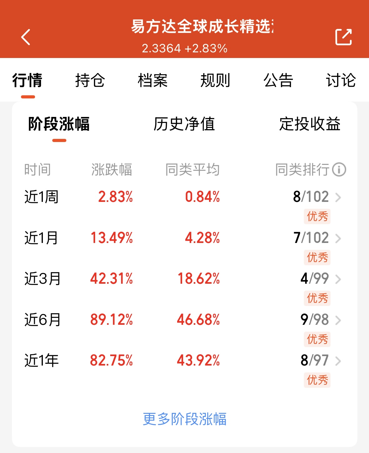 近一周2.83%,近一月13.49%,近三月42.31%,$易方达全球成长精选混合(QDII)人民币C(OTCFUND|012922)$的表现,一如既往的给力啊!还是经理的调仓能力给力了,追热点杠杠滴,美股A股港股灵活切换,才能有这么好的收益嘿嘿,满意!
