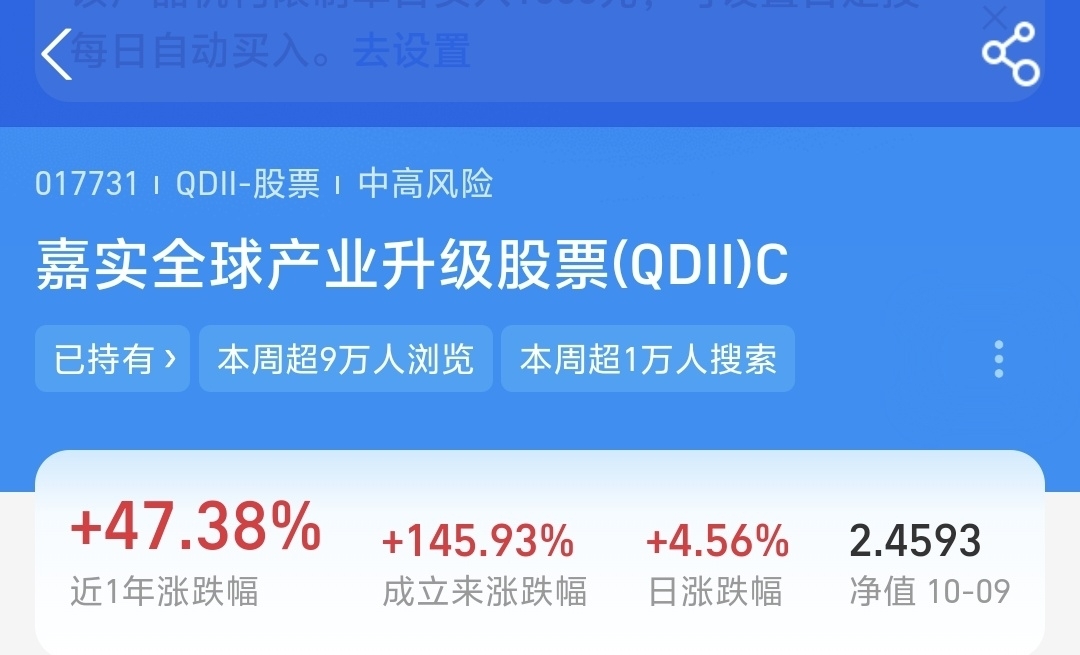 美股最近被贸易战和政府停摆吓到,调整了不少,但底子还在,之前涨得也不错。$嘉实全球产业升级股票发起式(QDII)C$ 最新净值+4.56%,一年涨了47.38%,表现很强。原因是它主要买了英伟达、新思科技等半导体龙头,股票仓位超过86%,精准抓住了AI算力和半导体的热潮。