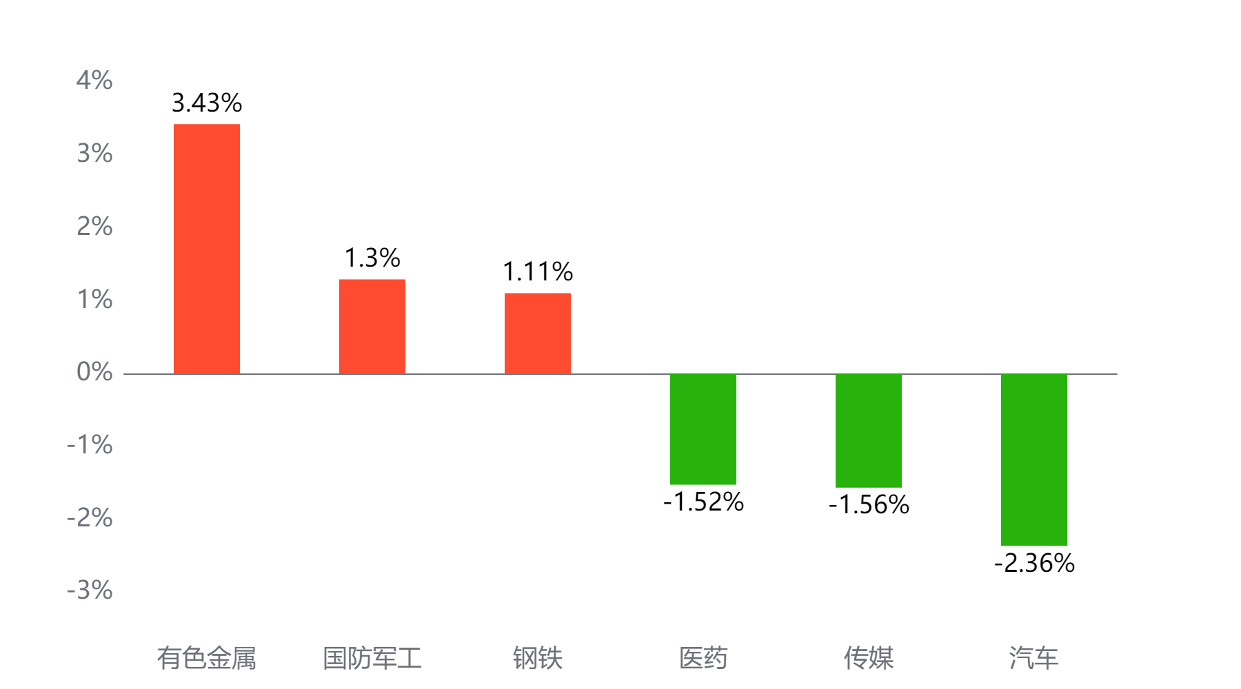 今天表现最好的行业板块依次为有色金属、国防军工、钢铁,表现最差的依次为医药、传媒、汽车。