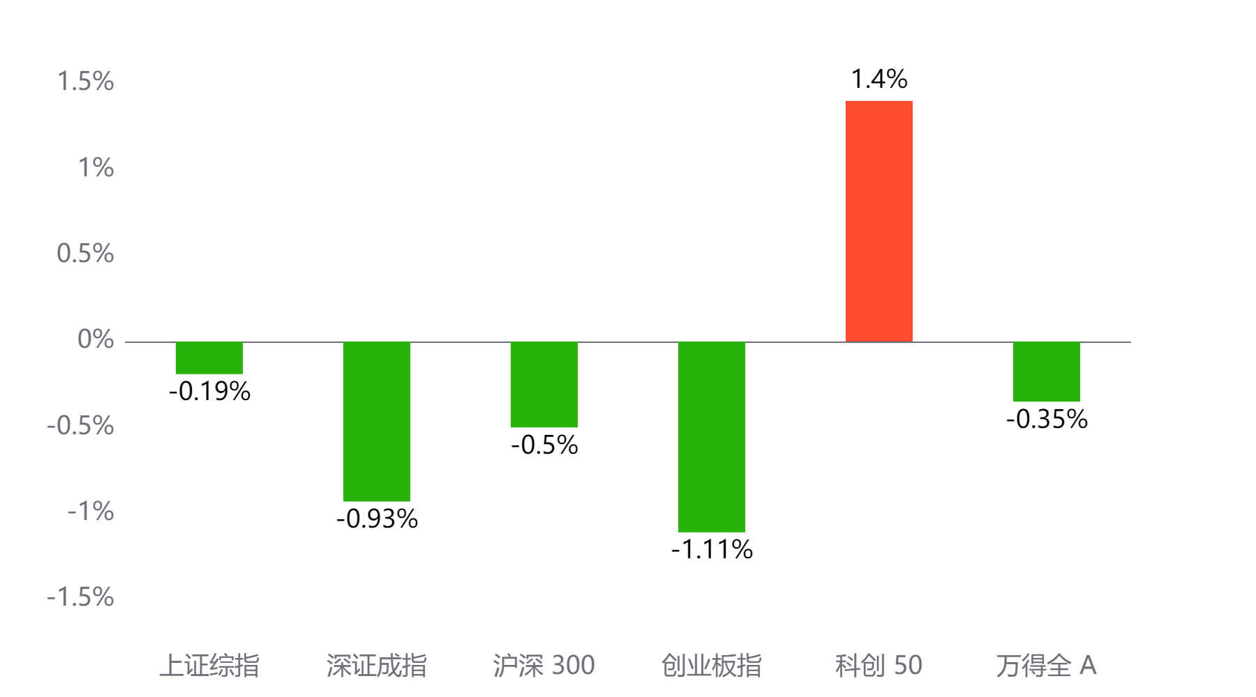 截至今日收盘,市场各主要指数普遍下跌。上证综指收3889.5点,下跌0.19%;深证成指收13231.47点,下跌0.93%;沪深300下跌0.5%,创业板指下跌1.11%,科创50上涨1.4%,万得全A下跌0.35%。